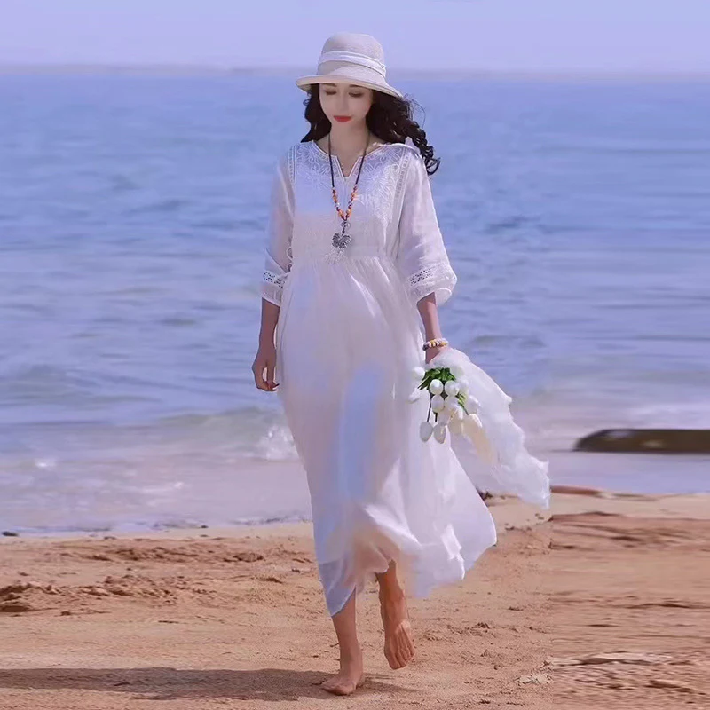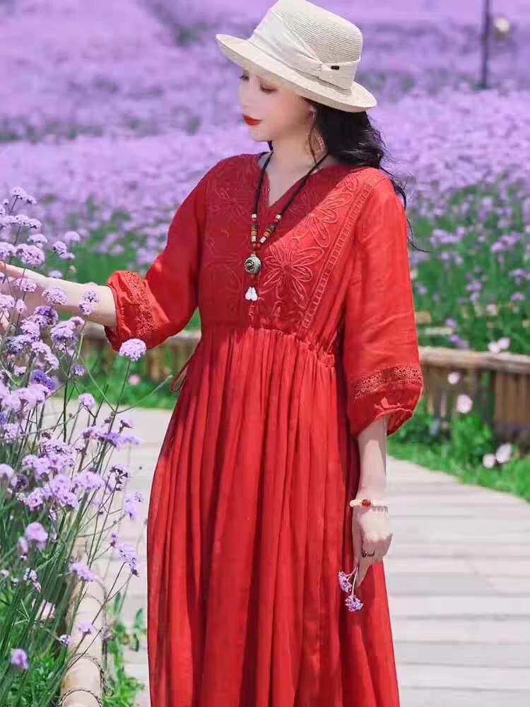 High-end temperament vacation casual V-neck embroidered dress summer new literary and retro elegant long dress