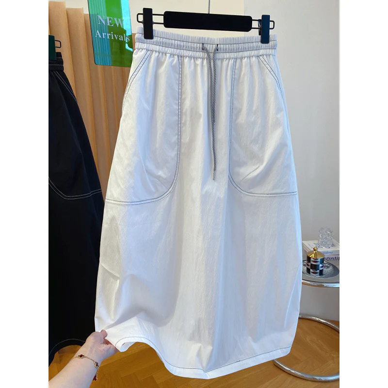 Black bright line tooling skirt women's summer new loose high waist temperament over the knee medium and long skirt