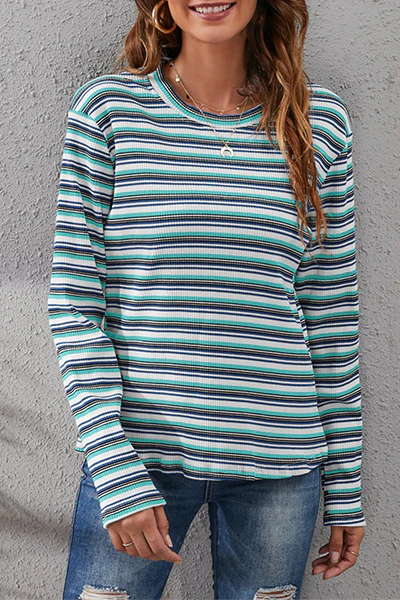 Casual Striped Patchwork Basic O Neck Tops(3 Colors)