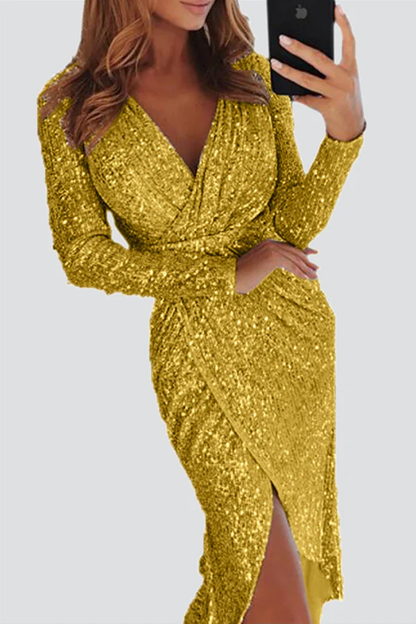 Fashion Elegant Solid Patchwork Sequined V Neck Evening Dress Dresses(5 Colors)