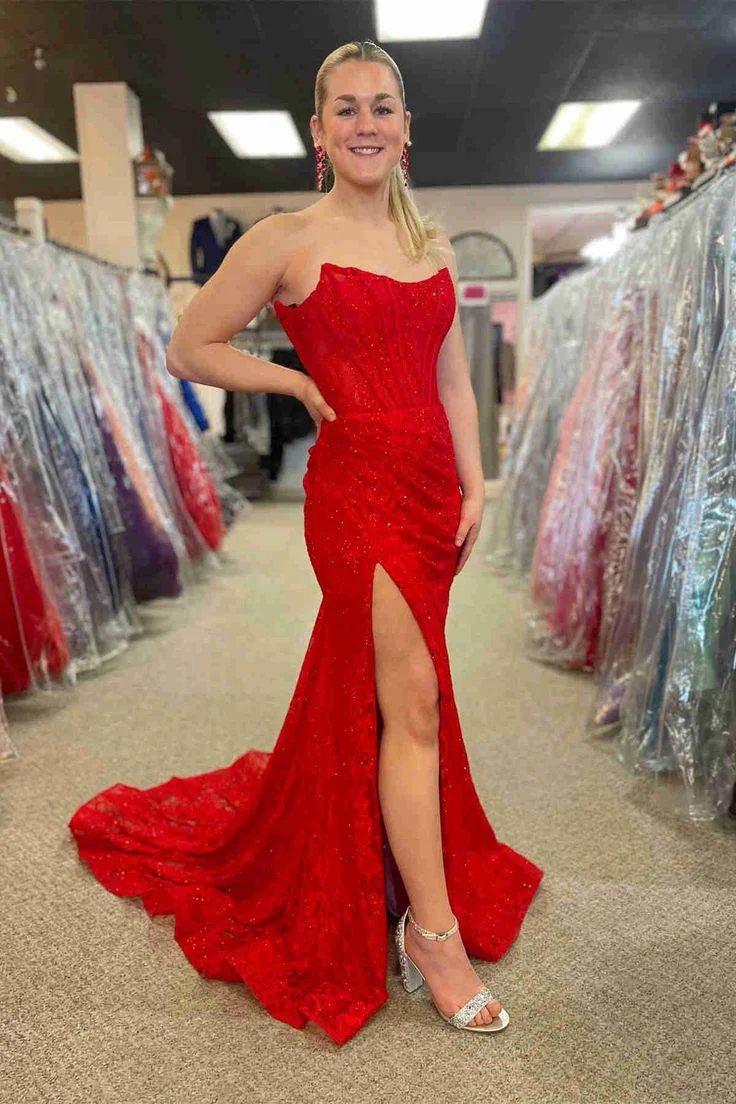 Pretty Mermaid Strapless Corset Lace Prom Dress with Slit DP295