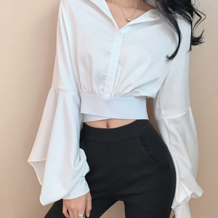 Christmas Gift Deanwangkt Spring Sexy Blouse Women V Neck Button Long Sleeve Vintage Casual Crop Tops Female Outdoor Korean Fashion Chiffon Shirt