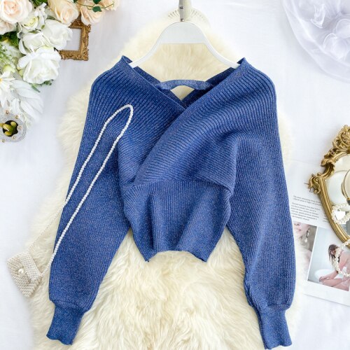 Christmas Gift 220 New Sexy V-neck Fashion Bright Silk Sweater Women's Autumn Bat Sleeves Short Waist Bottoming Shirt Winter Clothes Women