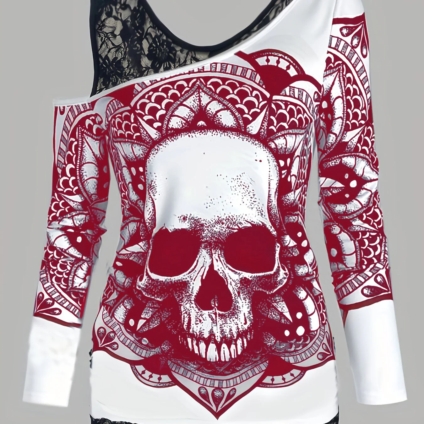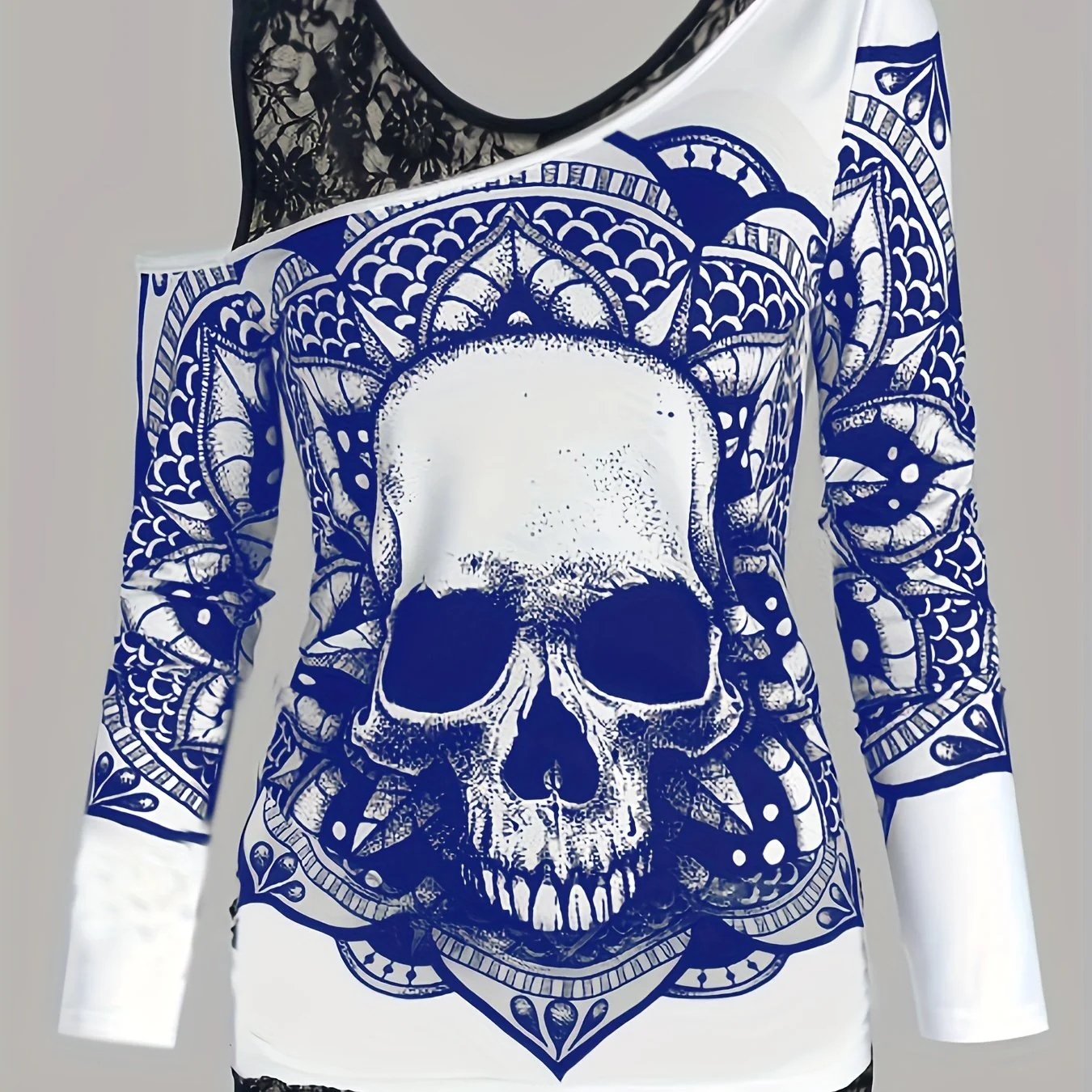 Plus Size Casual T-shirt, Women's Plus Skull & Mandala Print Contrast Lace Cold Shoulder Long Sleeve Slight Stretch T-shirt