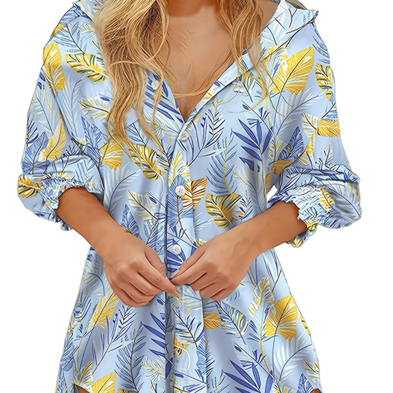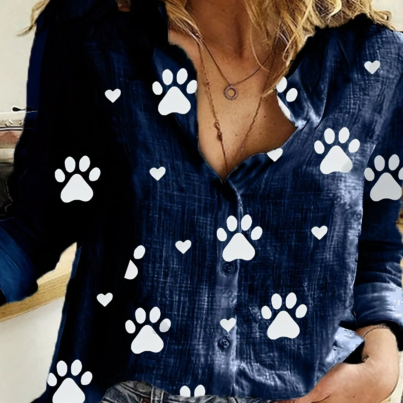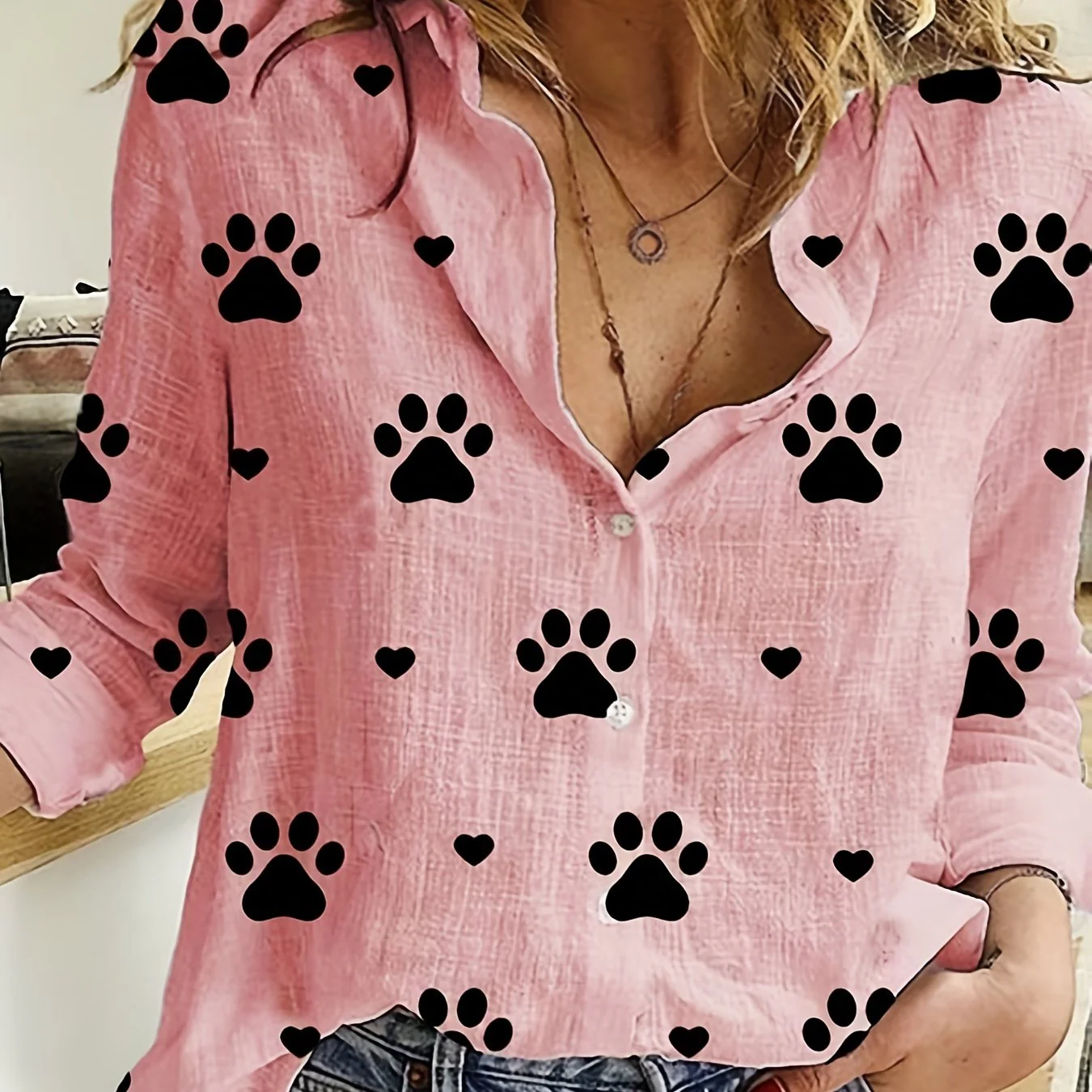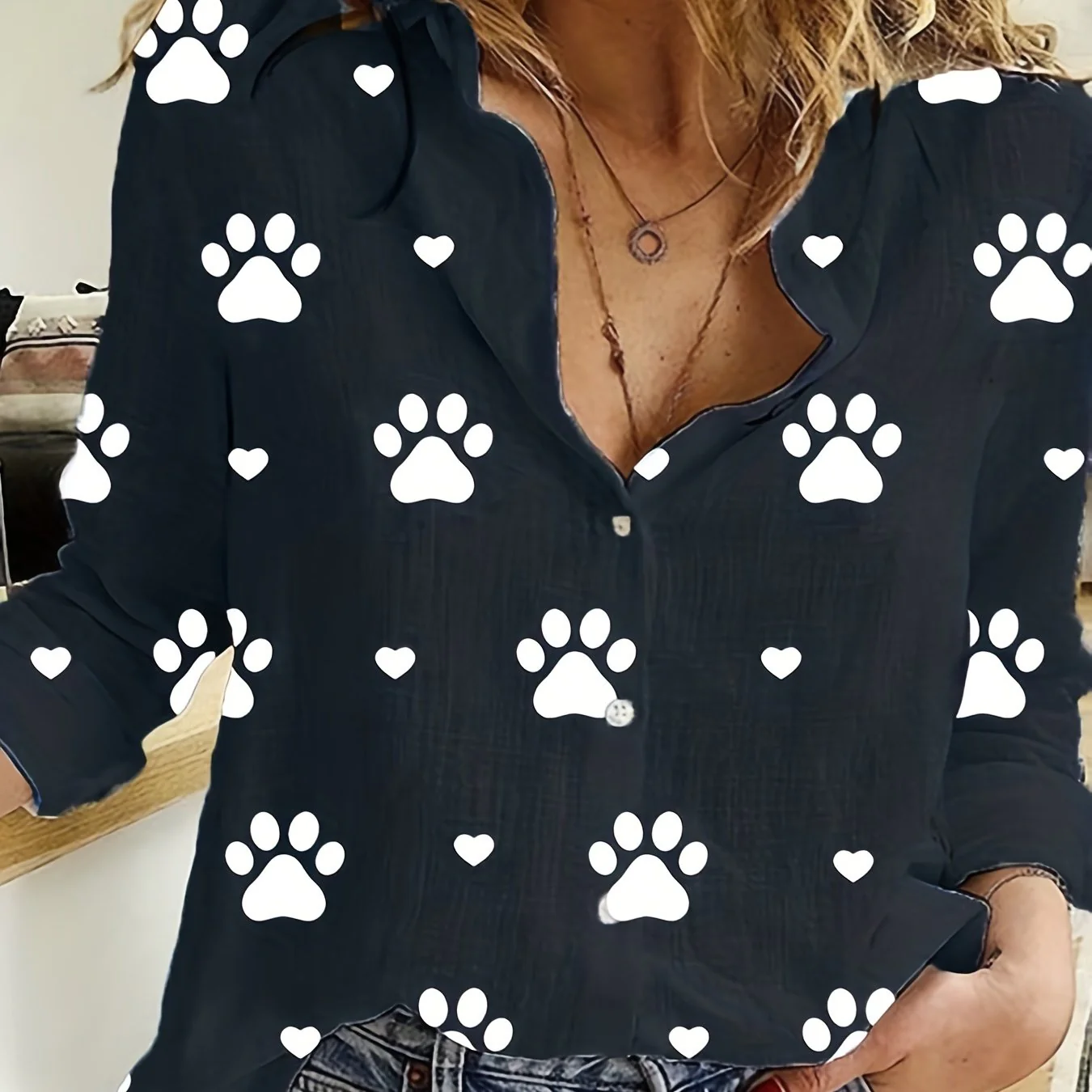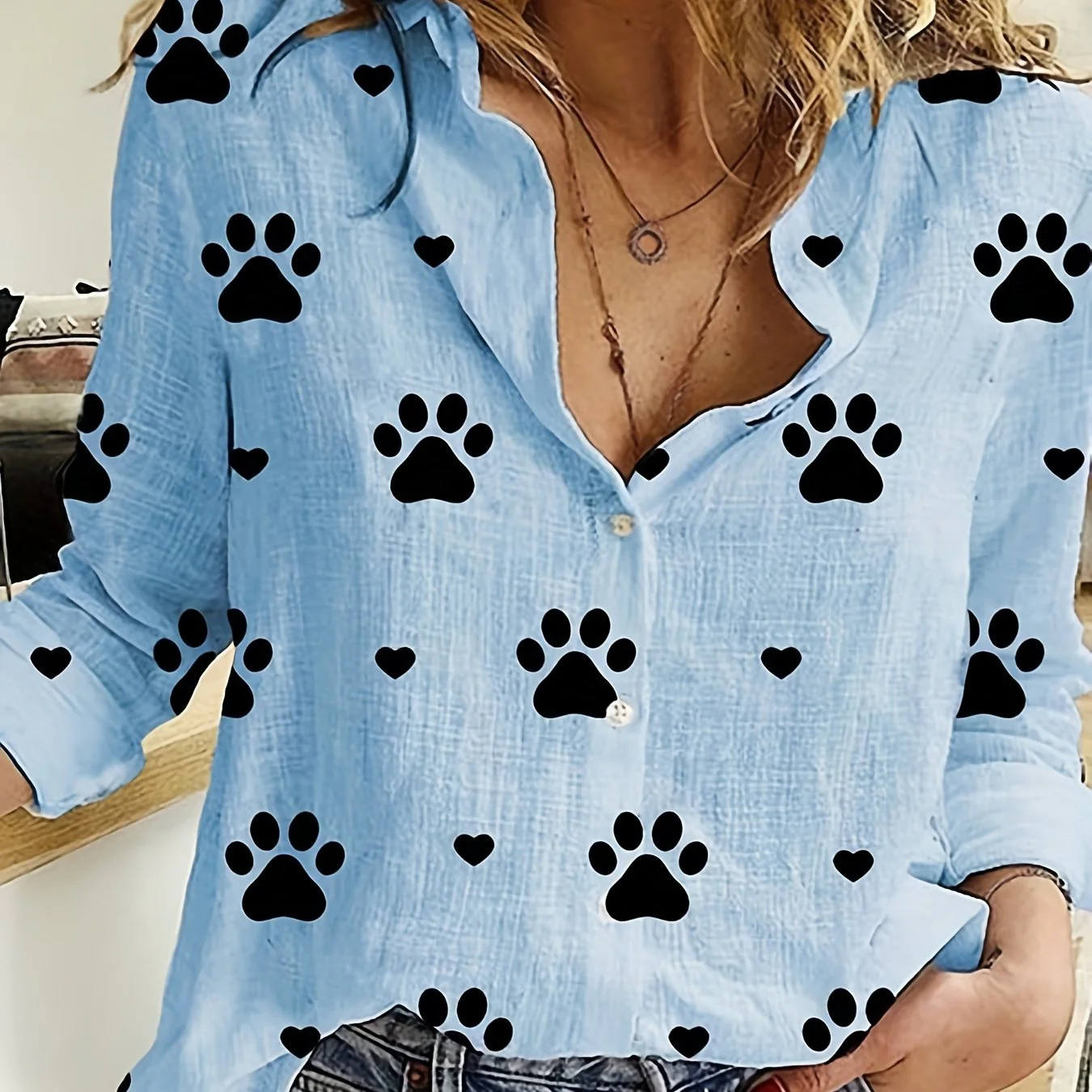 Paw Print Button Front Shirt, Casual Long Sleeve Shirt For Spring & Fall, Women's Clothing