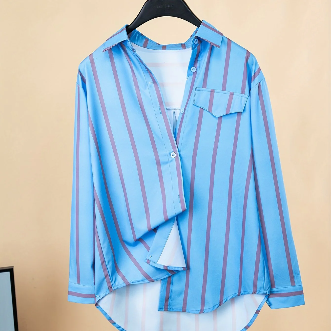 Striped Print Button Front Shirt, Casual Long Sleeve Hem Arc Collar Shirt, Women's Clothing