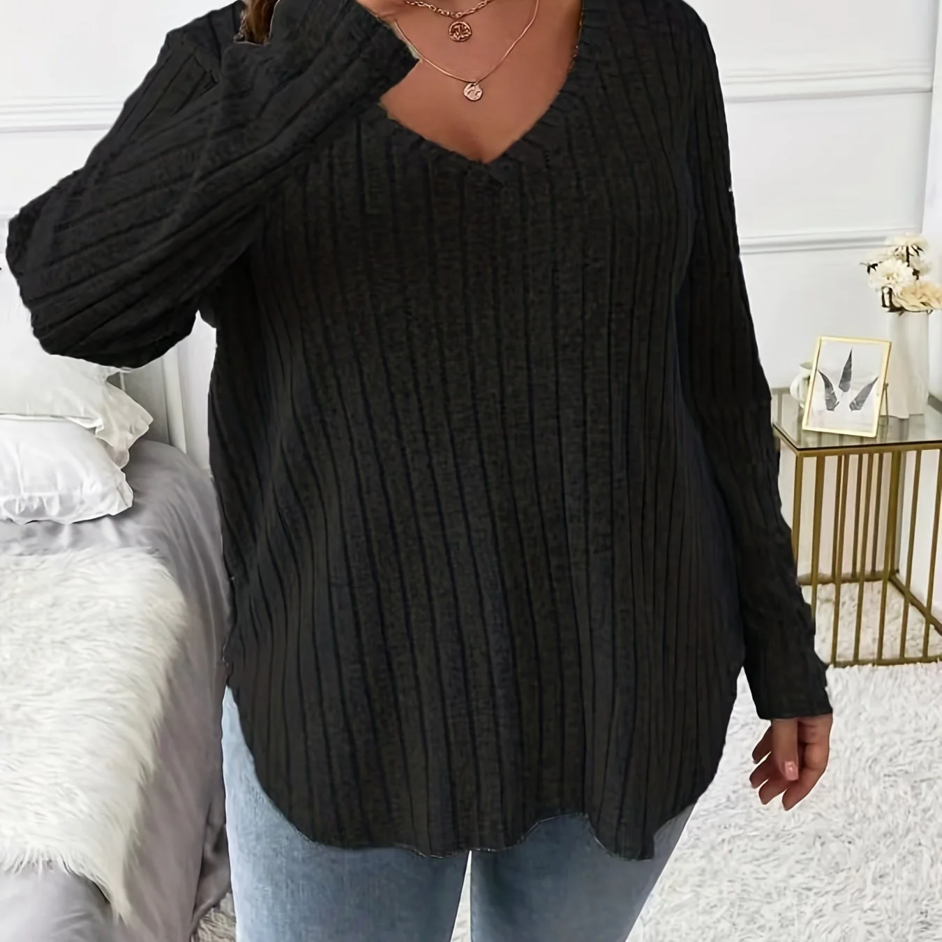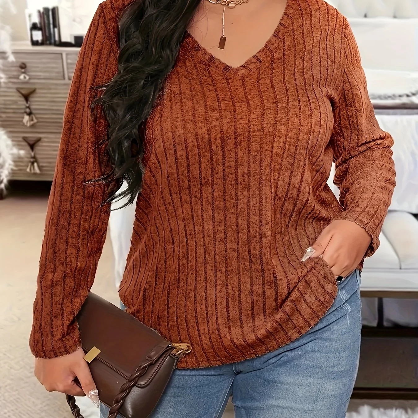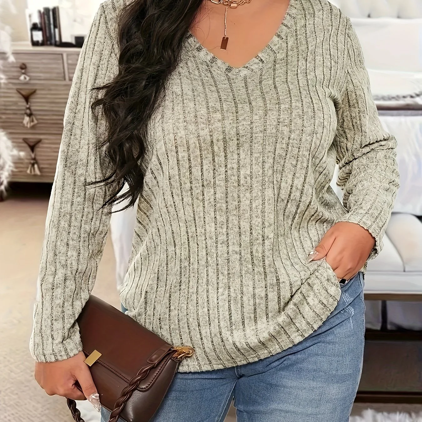Plus Size Casual T-shirt, Women's Plus Ribbed Solid Long Sleeve V Neck Slight Stretch Top