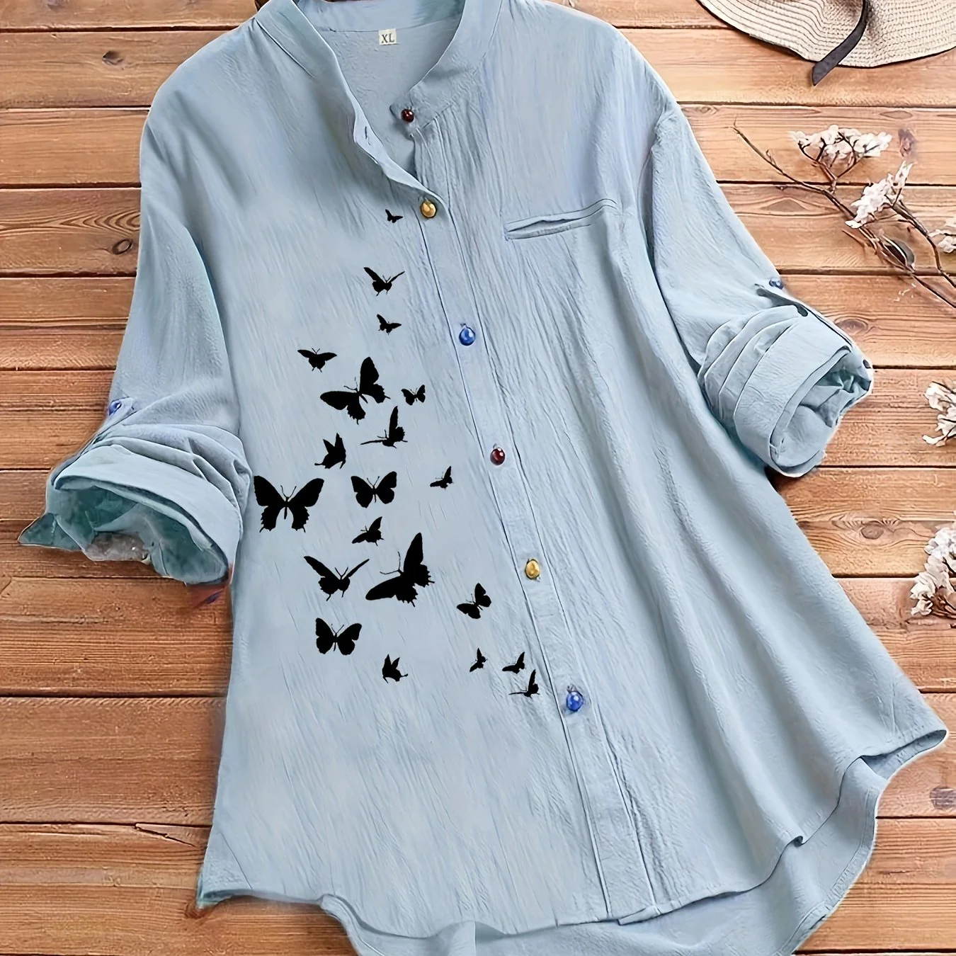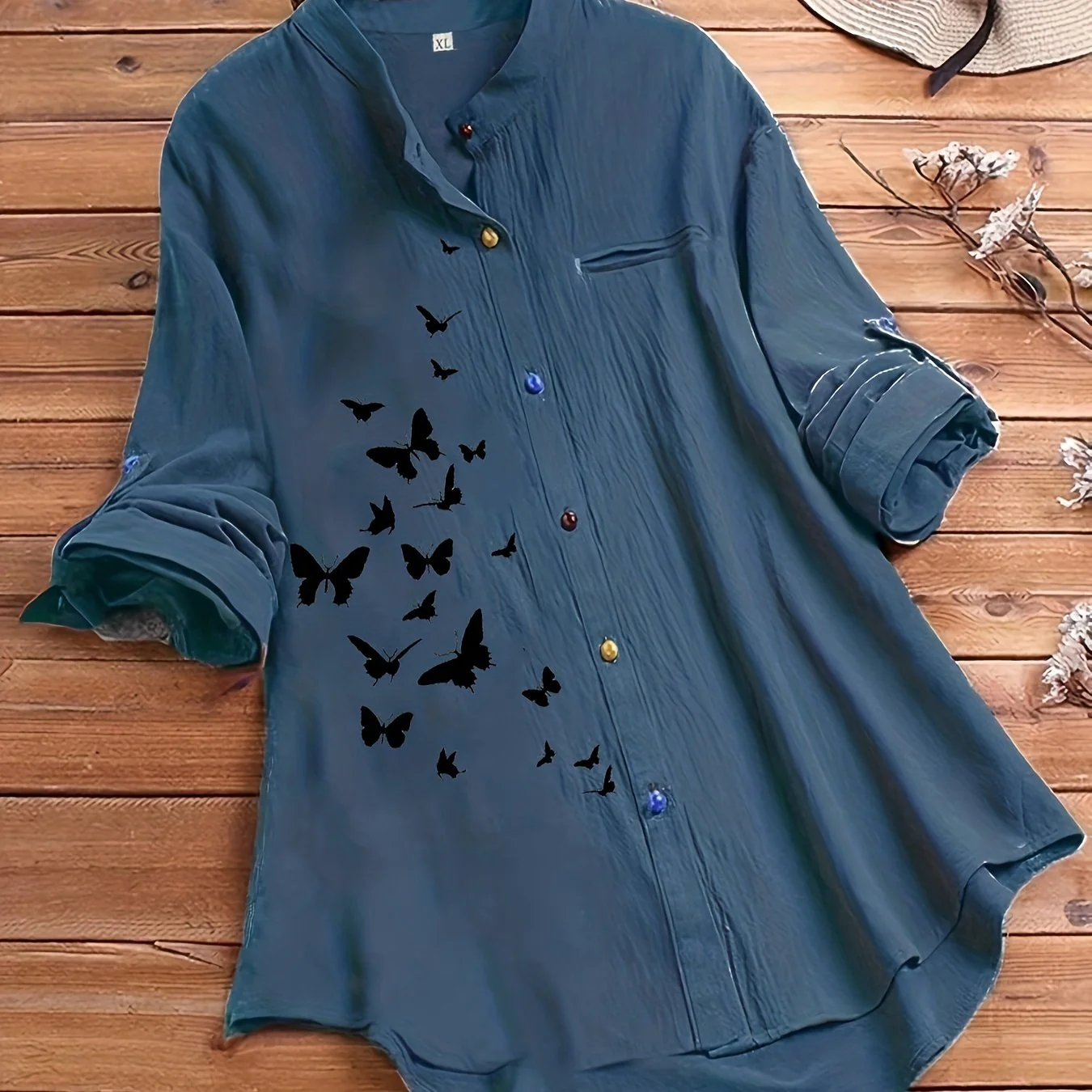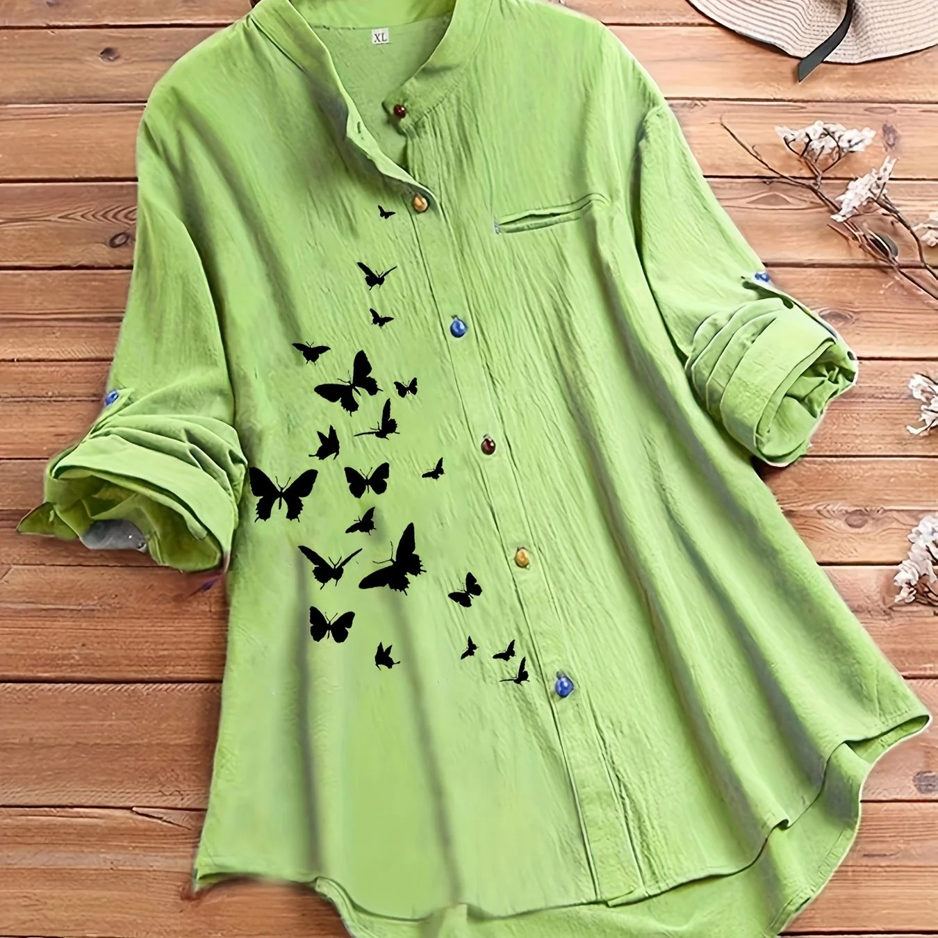 Plus Size Casual Shirt, Women's Plus Butterfly Print Roll Up Sleeve Stand Collar Button Up Blouse
