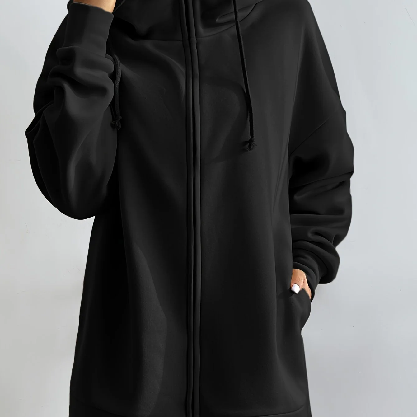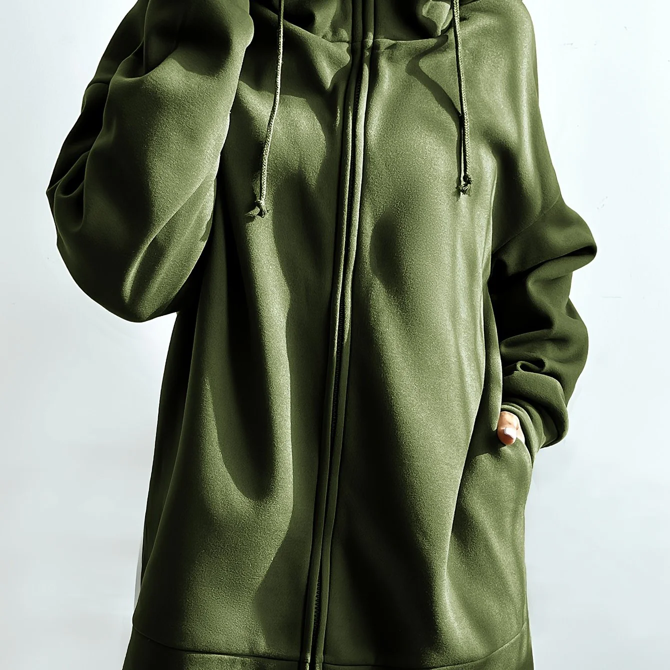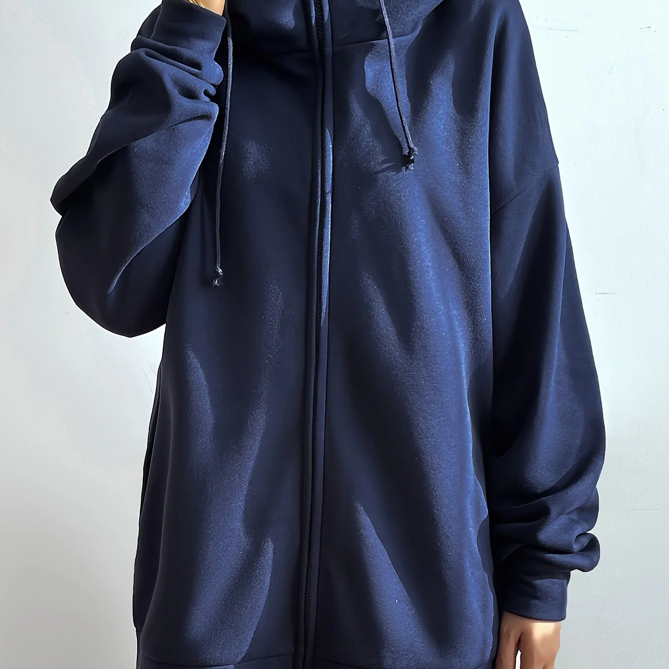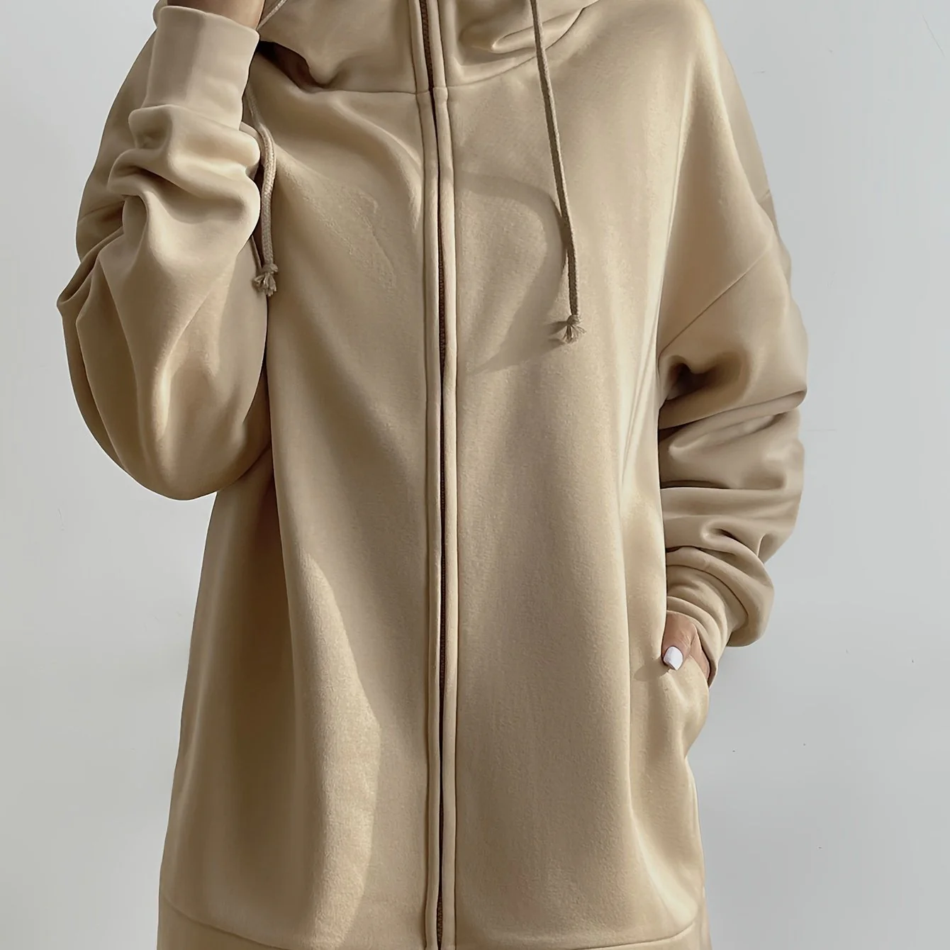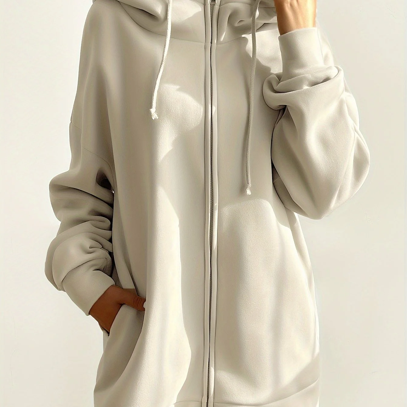 Hooded Casual Sports Fleece Sweatshirt, Solid Color Zipper Up Drawstring Hoodie, Women's Tops
