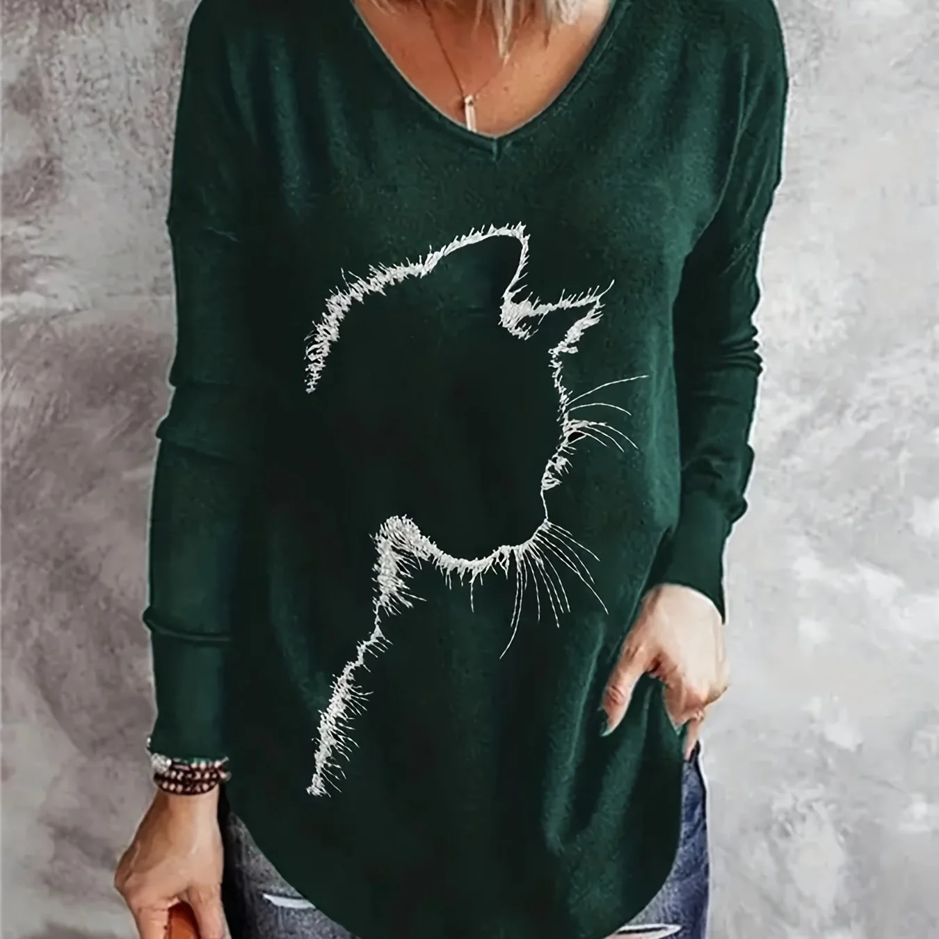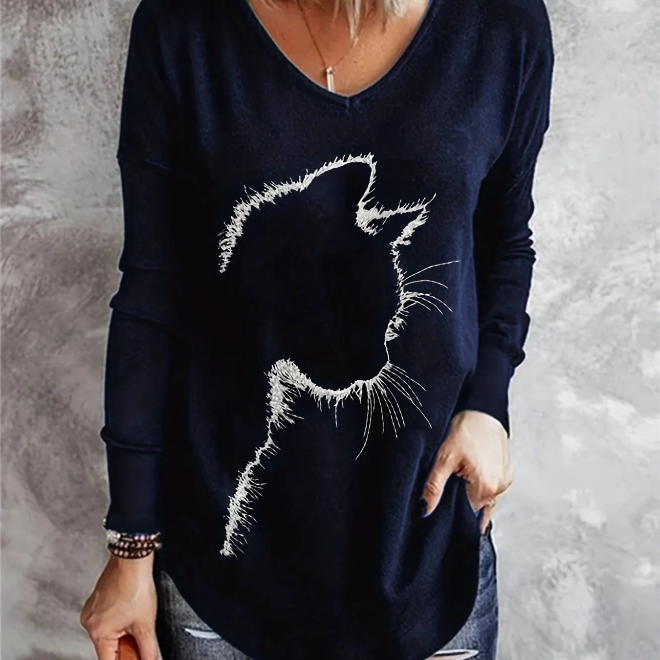 Plus Size Casual T-shirt, Women's Plus Cat Print Long Sleeve V Neck Slight Stretch Top