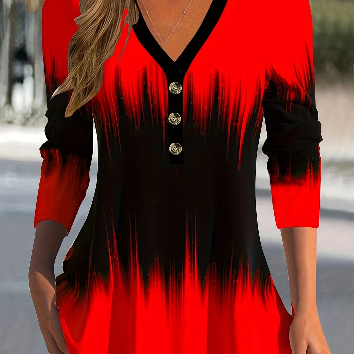 Plus Size Casual T-shirt, Women's Plus Ombre Stripe Print Button Decor Long Sleeve V Neck Slight Stretch T-shirt