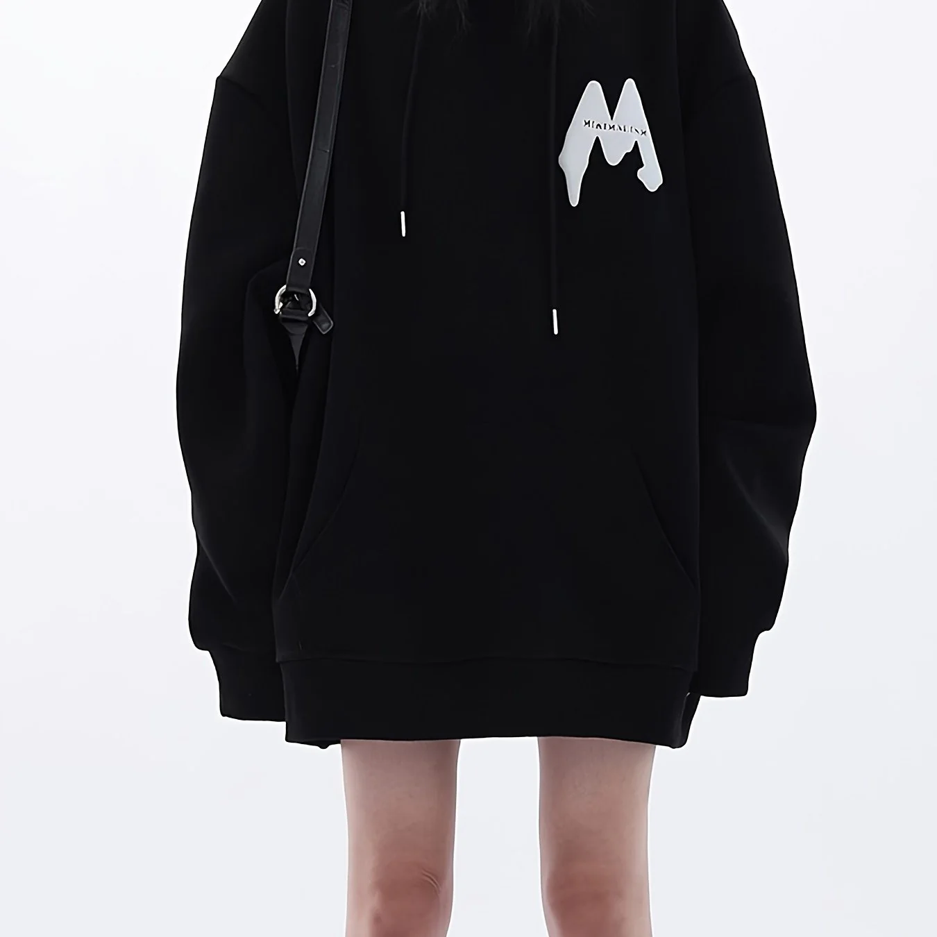 Minimalism Letter Print Drawstring Oversized Pocket Hoodies, Casual Fall Winter Sweatshirt, Women's Clothing