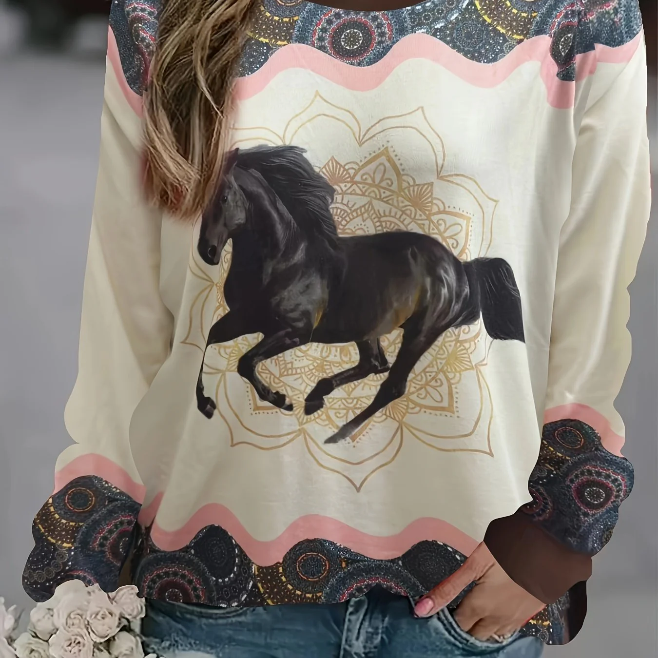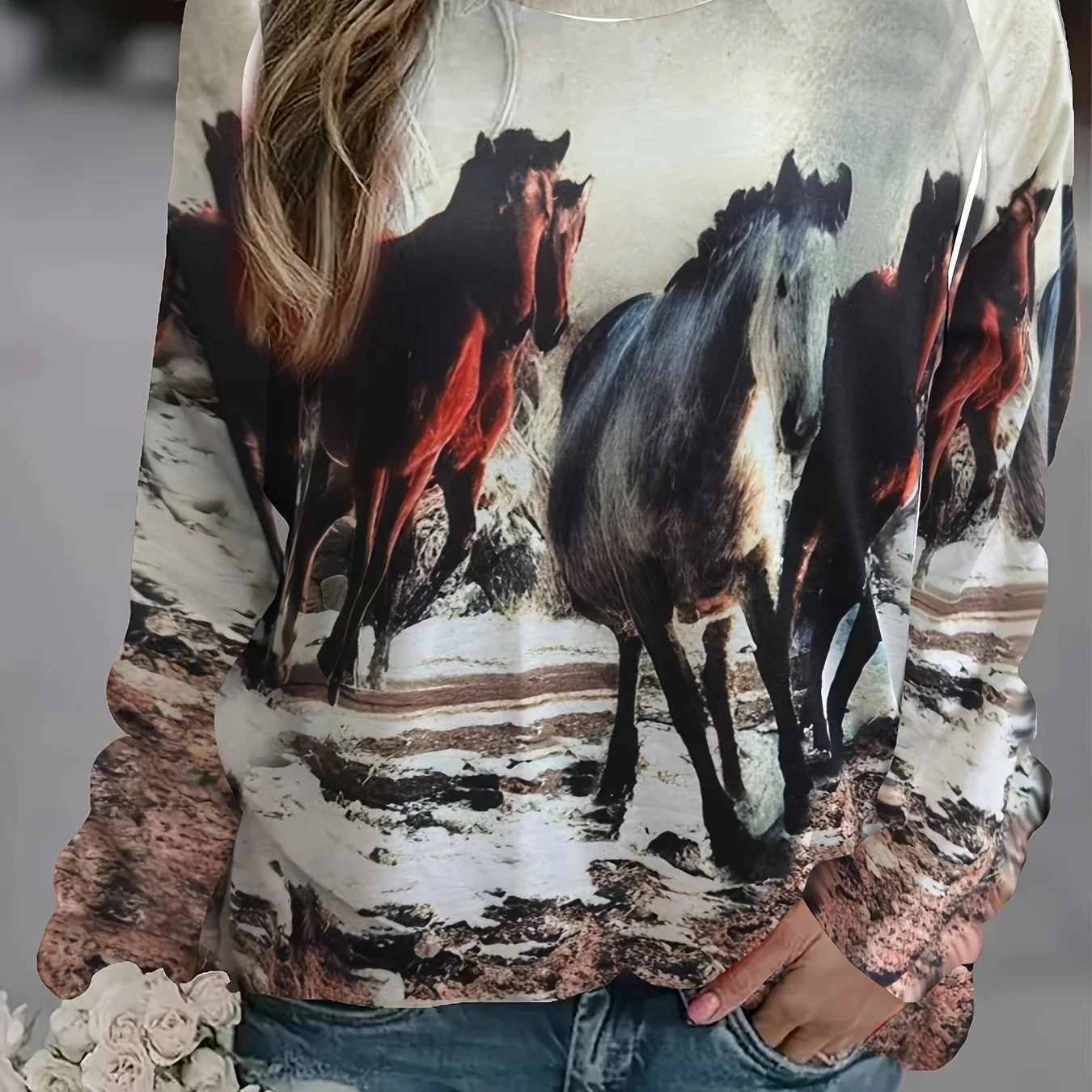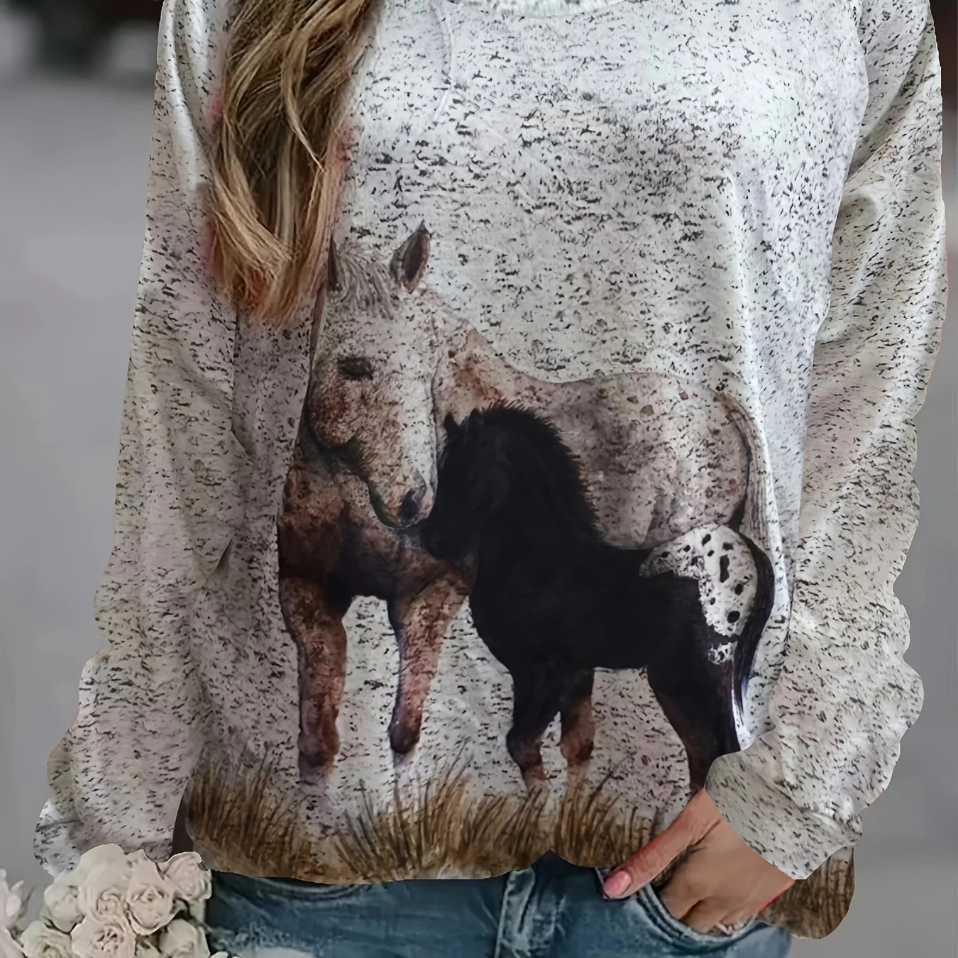 Horse Head Print Pullover Sweatshirt, Casual Long Sleeve Crew Neck Sweatshirt For Fall & Winter, Women's Clothing