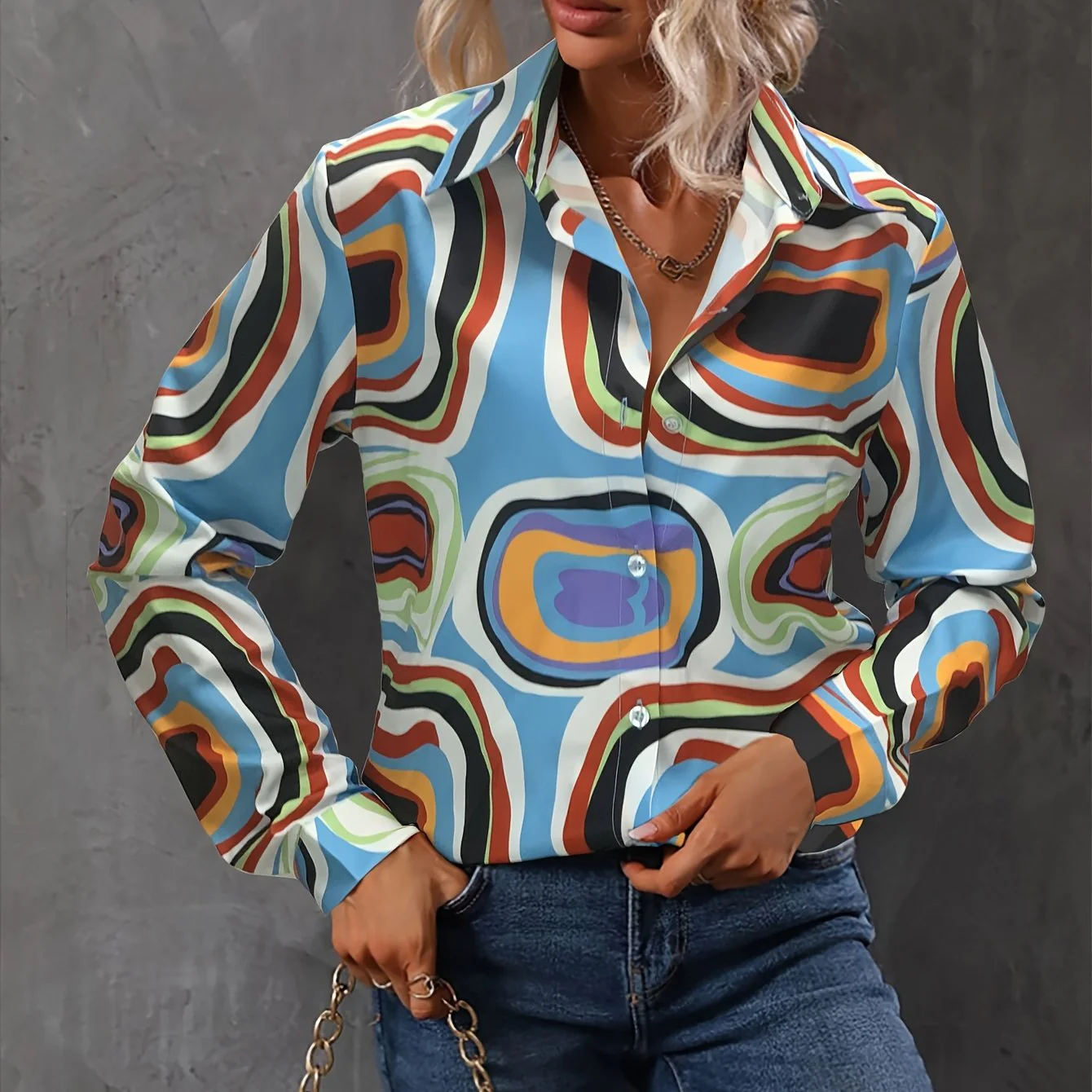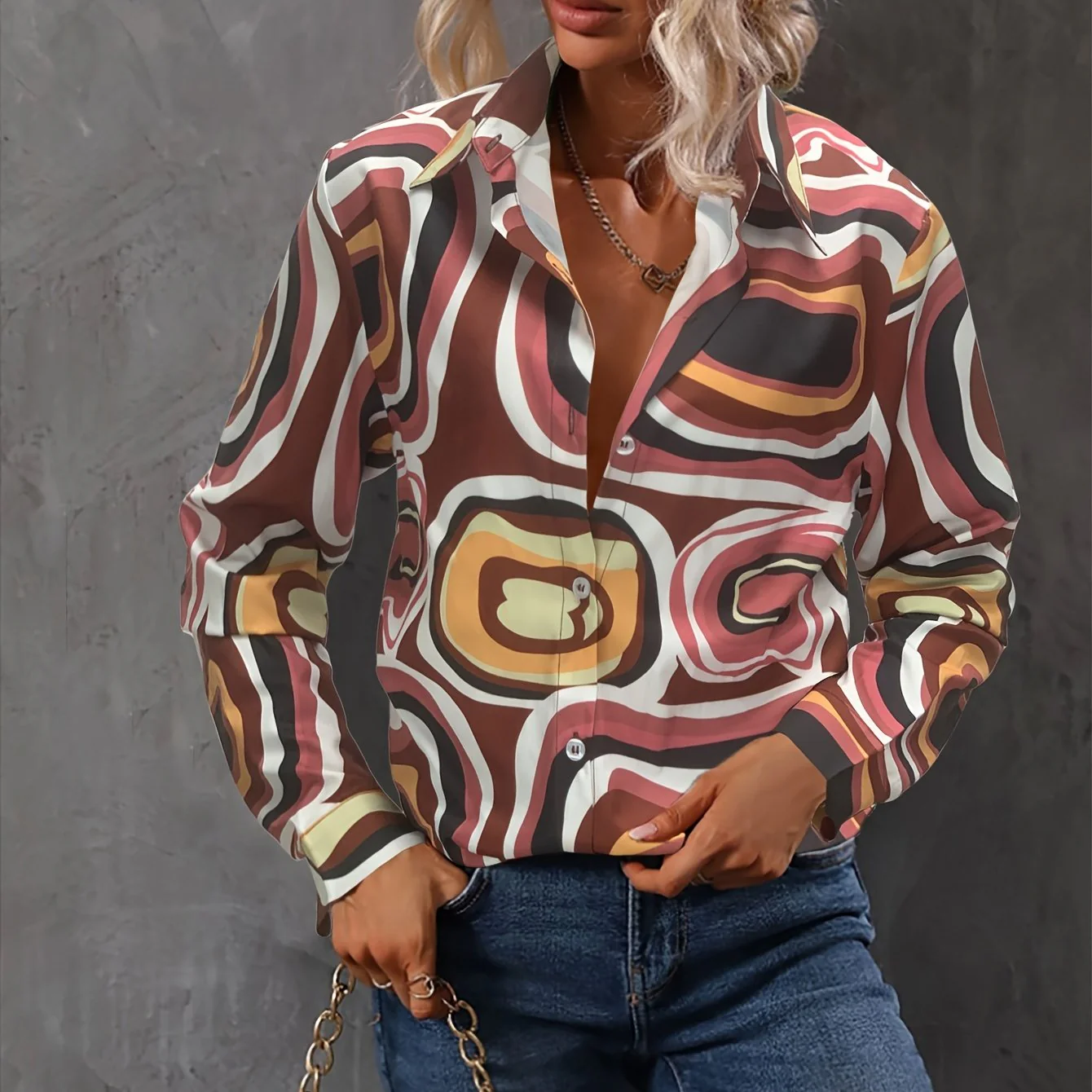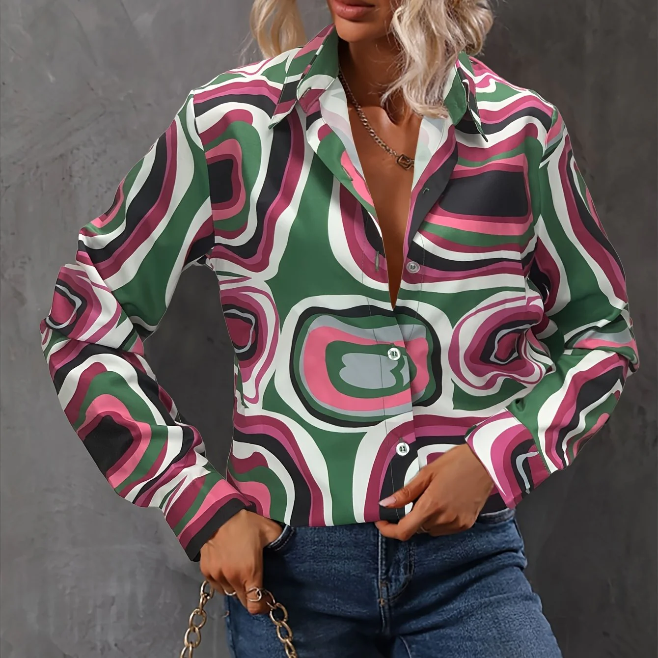 Abstract Print Shirt, Casual Button Front Long Sleeve Shirt, Women's Clothing