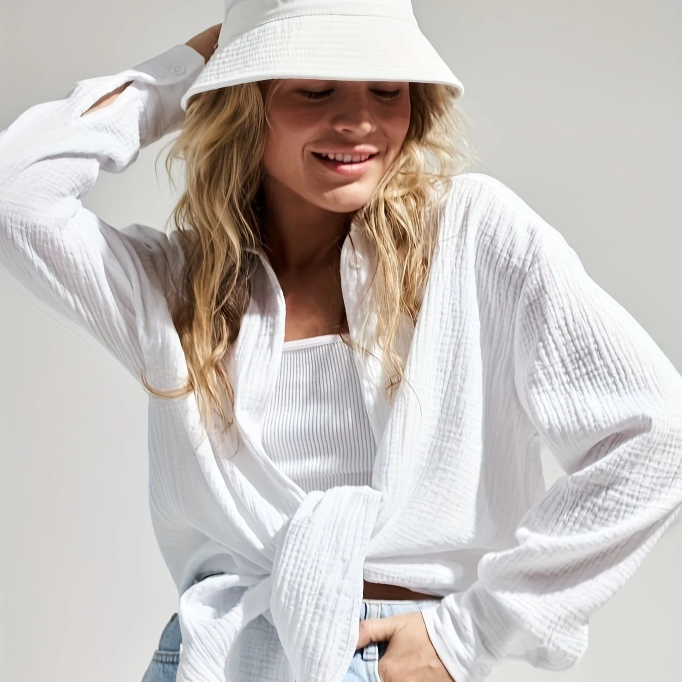 Waffle Solid Shirt, Casual Button Front Long Sleeve Shirt, Women's Clothing