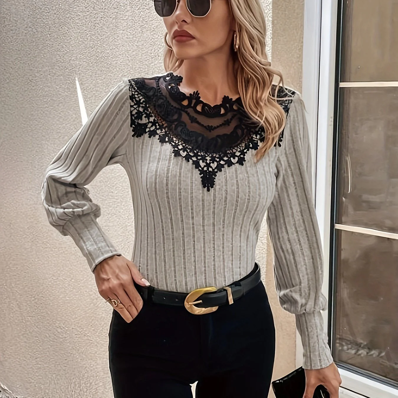 deanwangkt-1 Lace Stitching Ribbed T-Shirt, Elegant Long Sleeve Top For Spring & Fall, Women's Clothing