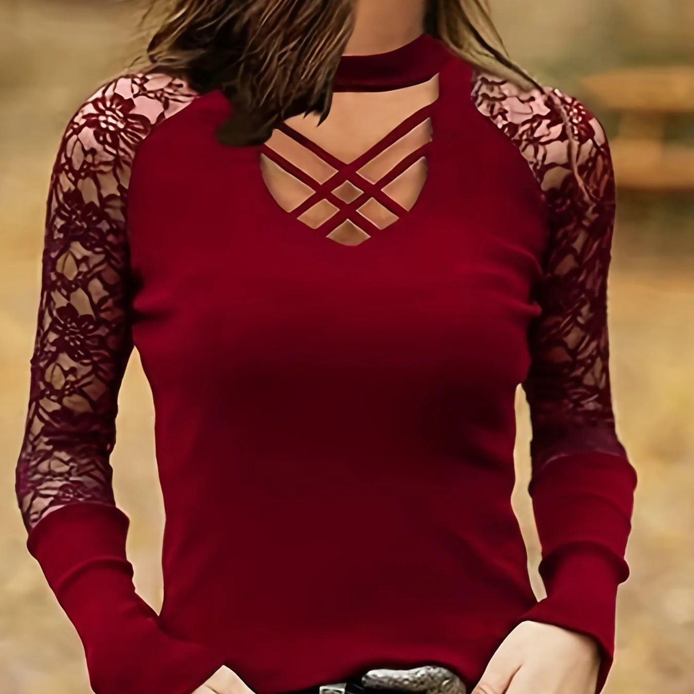 deanwangkt-1 Lace Stitching Solid T-shirt, Sexy Criss Cross Long Sleeve Crew Neck T-shirt, Women's Clothing