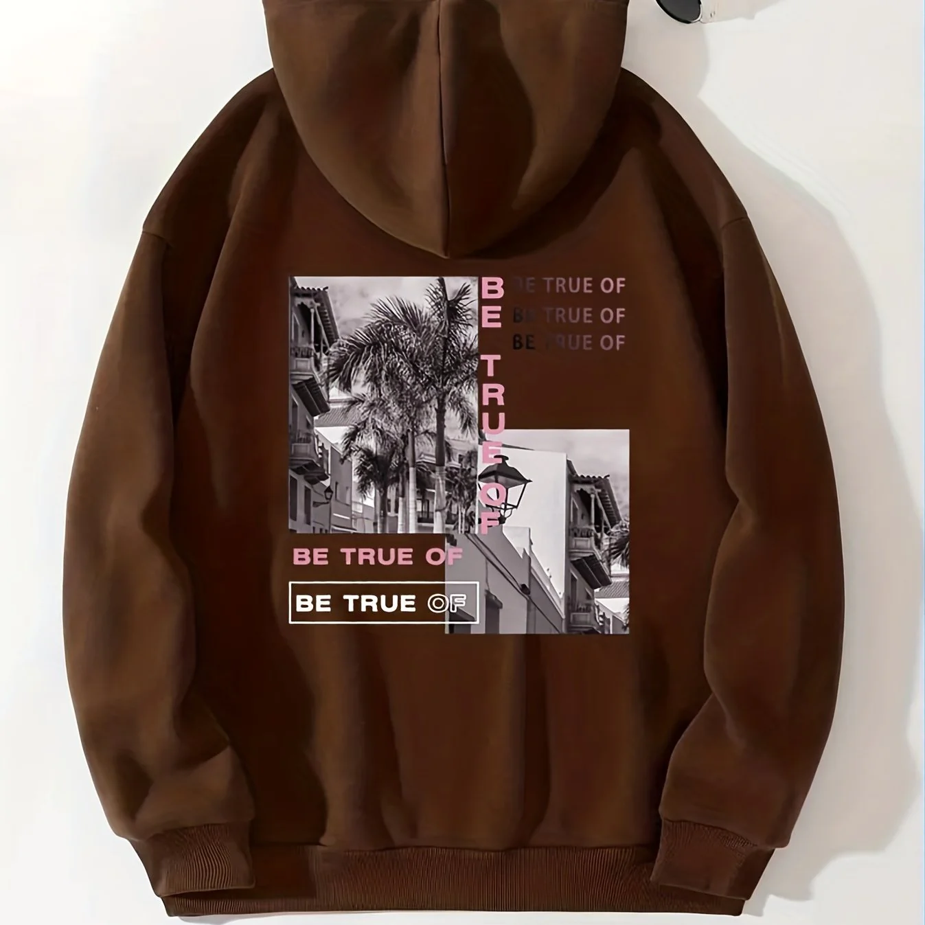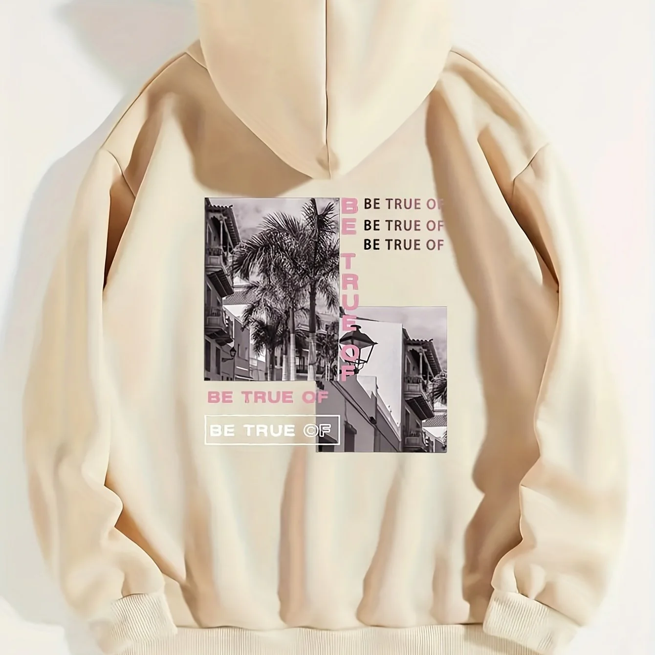 deanwangkt-1 Building Tree Graphic Long Sleeve Fleece Hooded Sweatshirts, Letter Print Drawstring Sports Hoodie With Front Pocket, Women's Sporty Sweatshirts