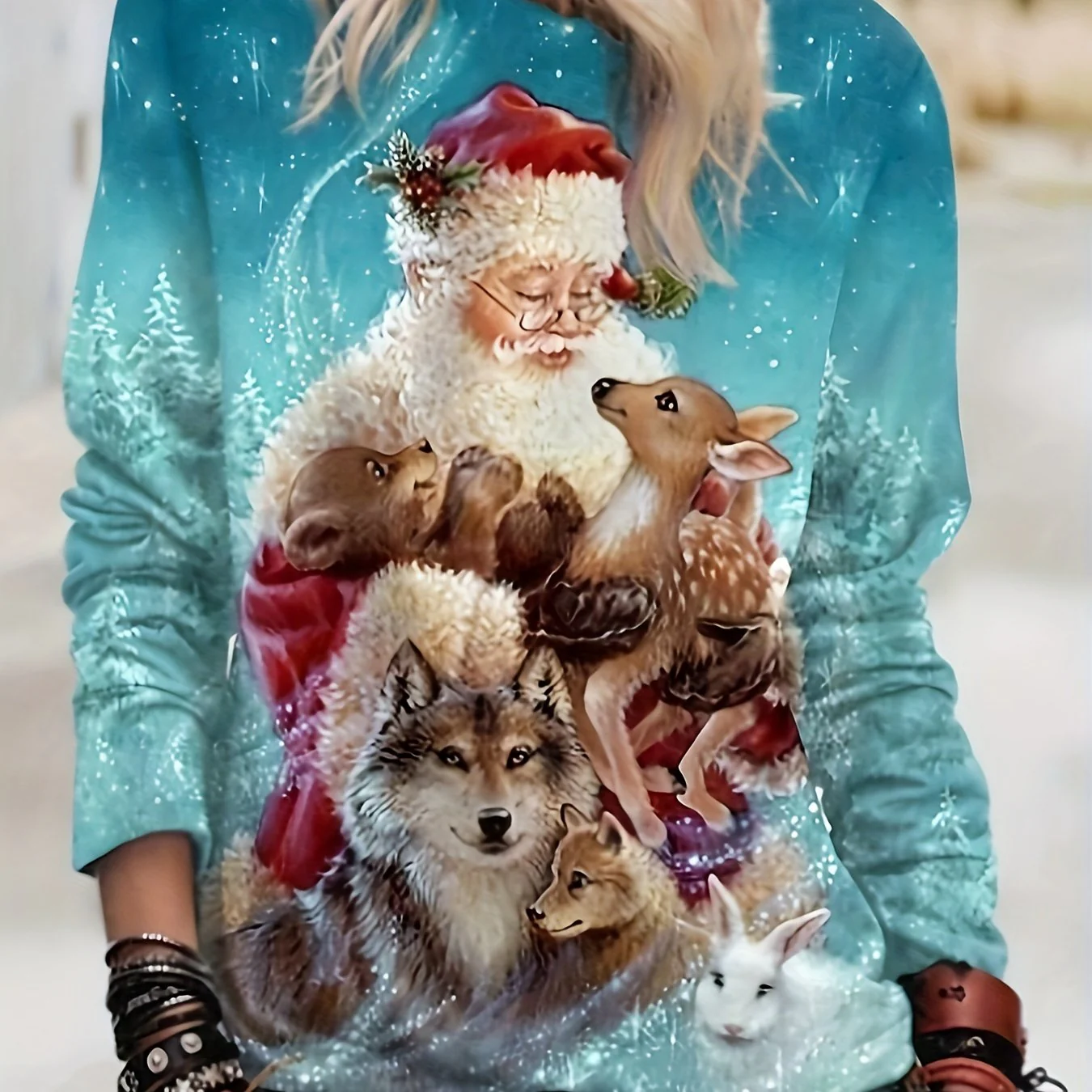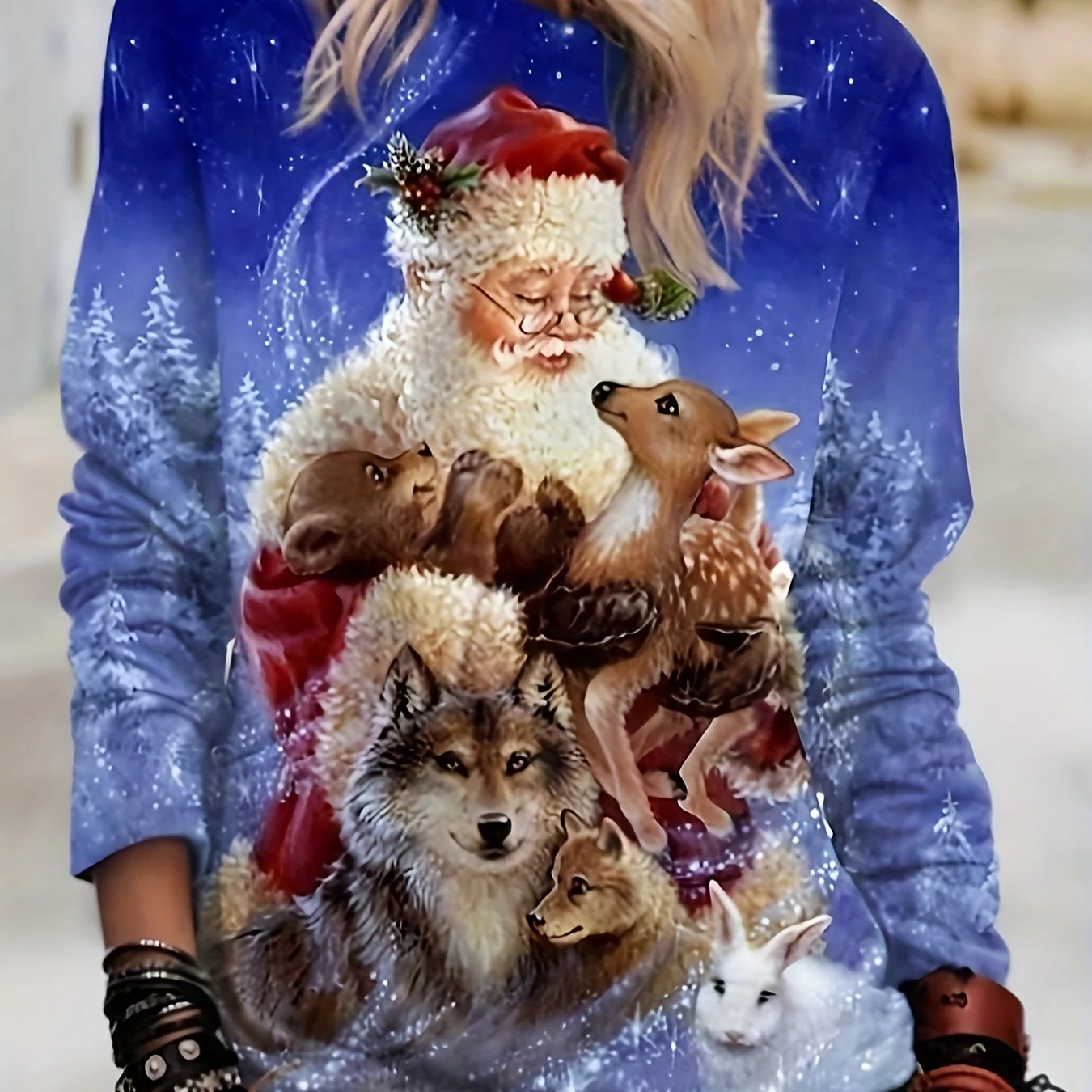 deanwangkt-1 Christmas Santa & Elk Print Crew Neck T-Shirt, Casual Long Sleeve Top For Spring & Fall, Women's Clothing
