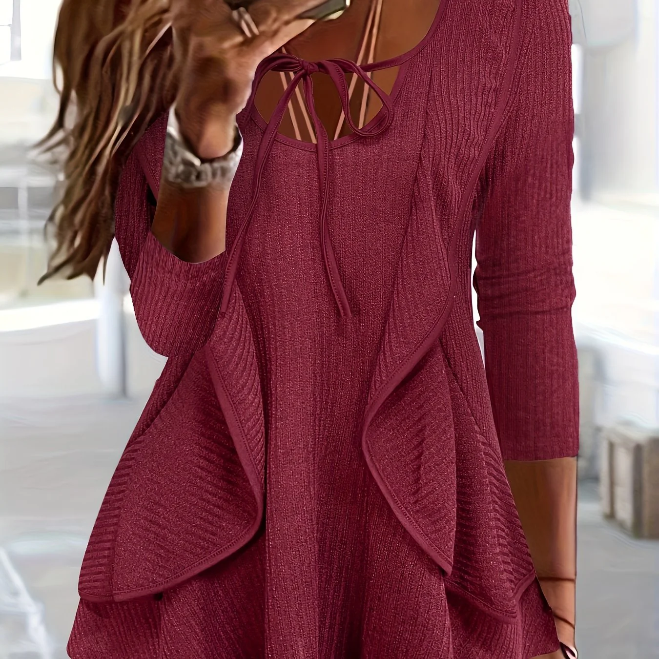 deanwangkt-1 Tie Front Ruffle Trim T-Shirt, Casual Long Sleeve Top For Spring & Fall, Women's Clothing