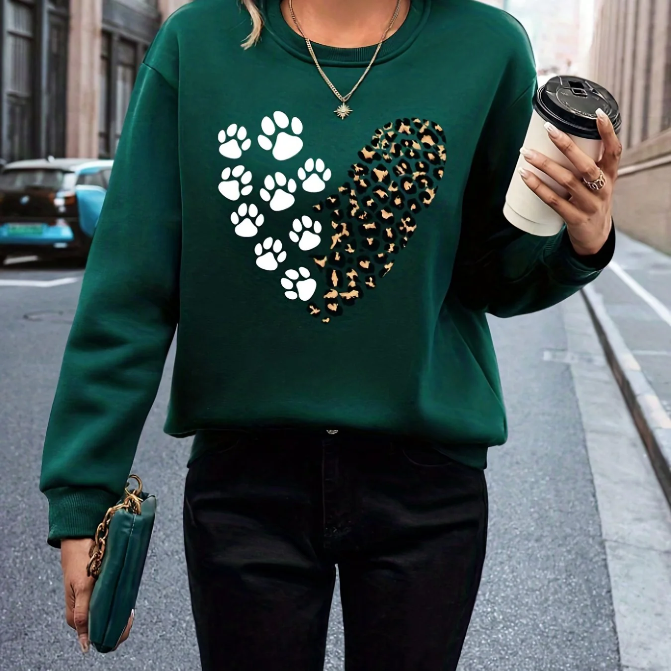 deanwangkt Leopard & Paw Print Pullover Sweatshirt, Casual Long Sleeve Crew Neck Sweatshirt For Fall & Winter, Women's Clothing