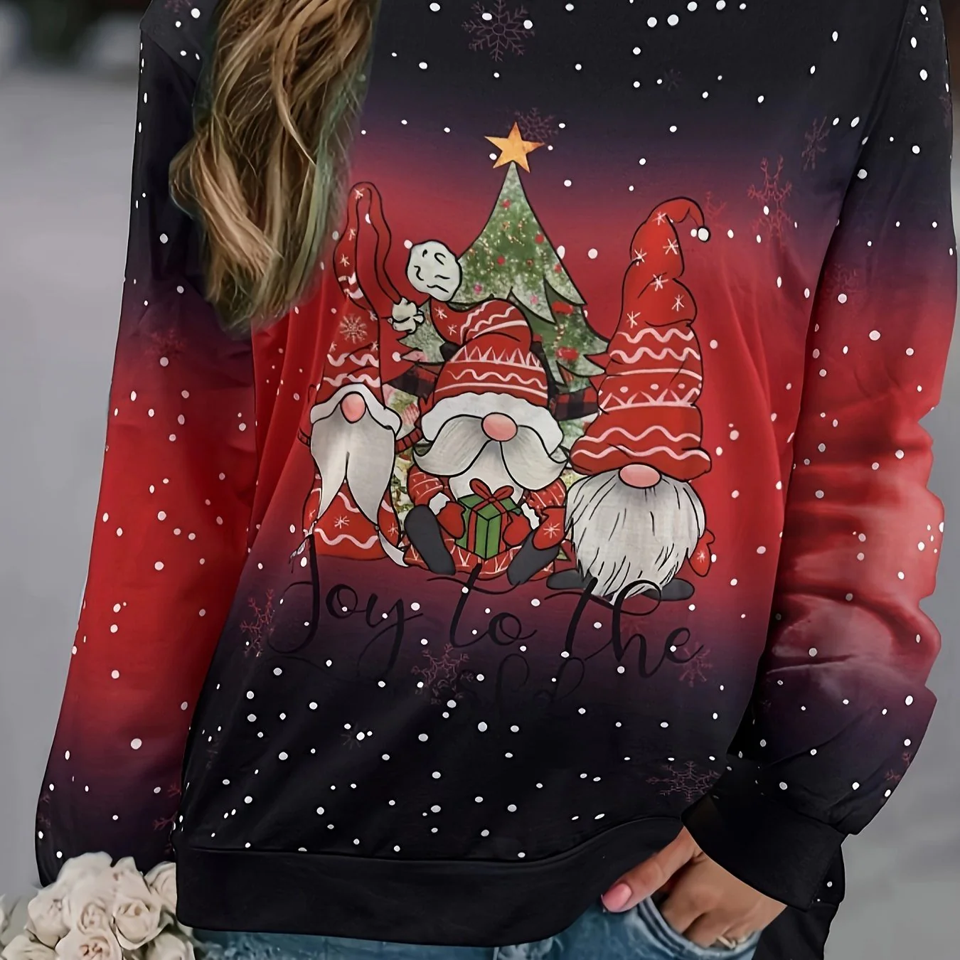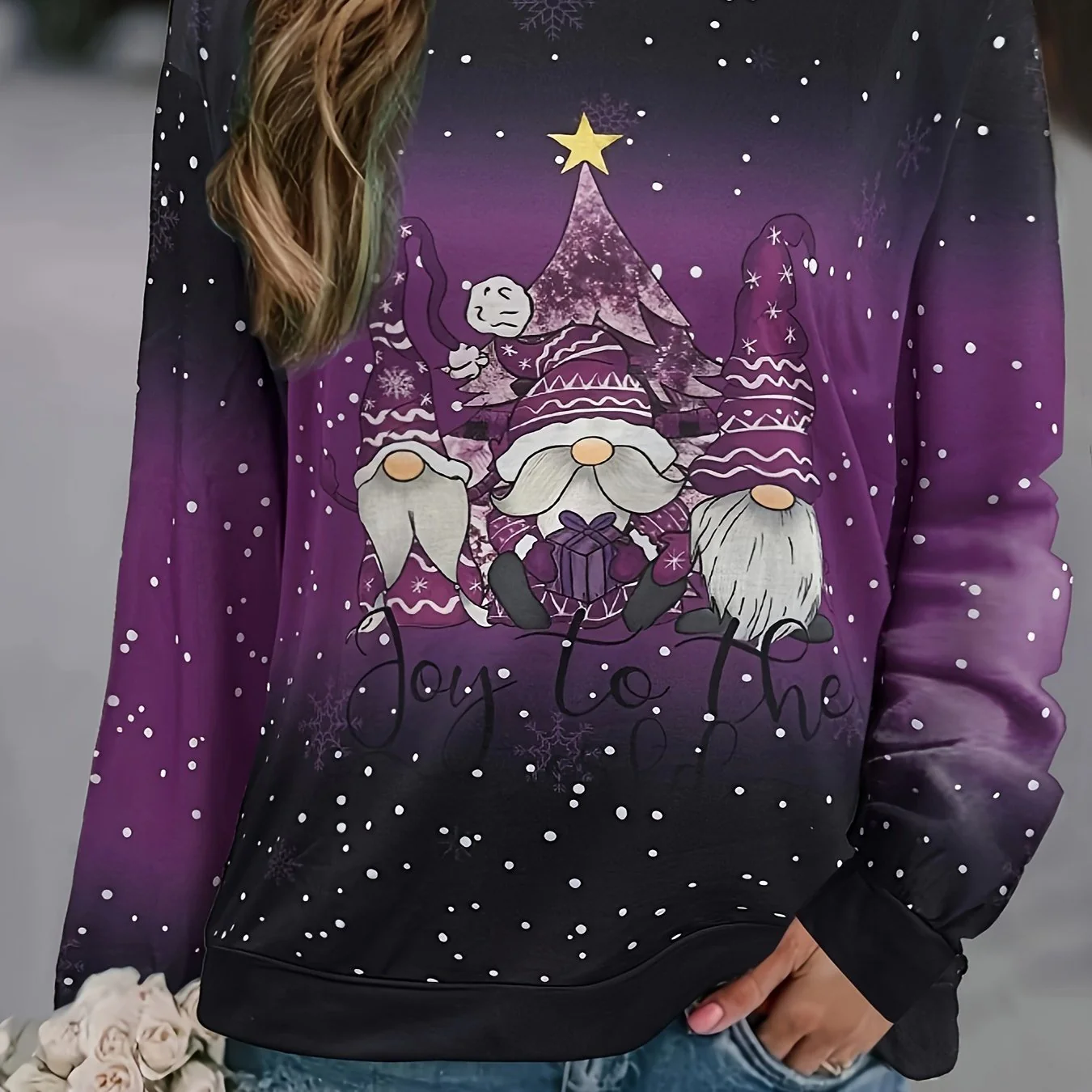 deanwangkt-1 Plus Size Christmas Casual Sweatshirt, Women's Plus Snowflake & Gnomes Print Long Sleeve Round Neck Medium Stretch Pullover Top