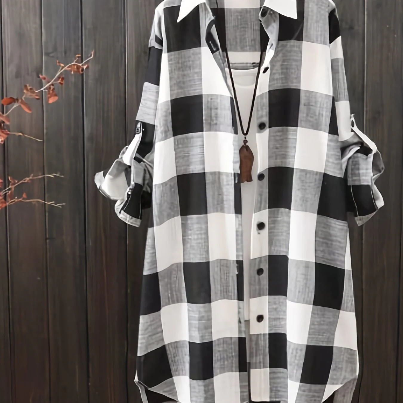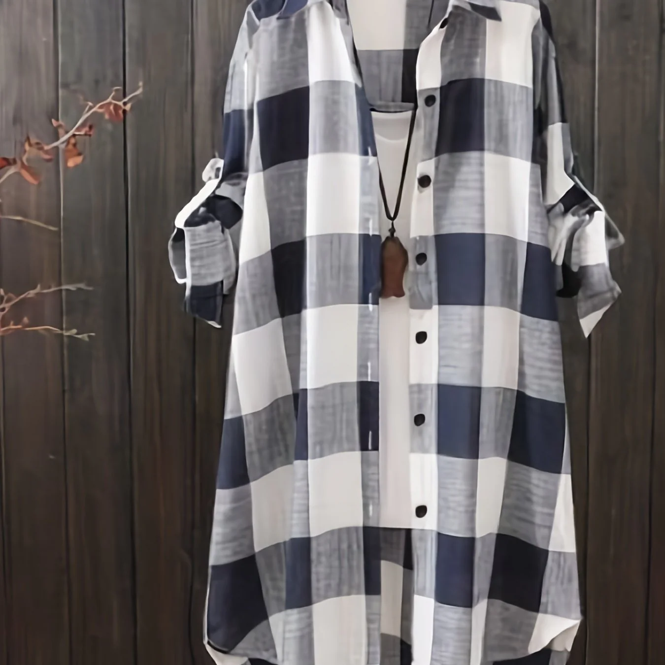 deanwangkt Plaid Print Dipped Hem Shirt, Casual Mid Length Button Front Turn Down Collar Long Sleeve Shirt, Women's Clothing