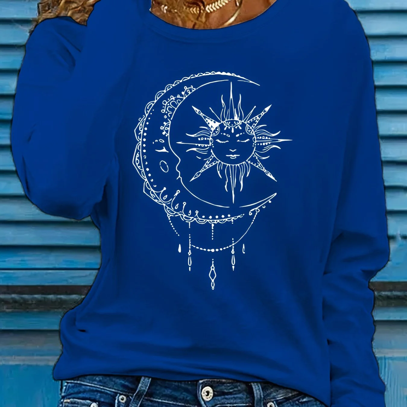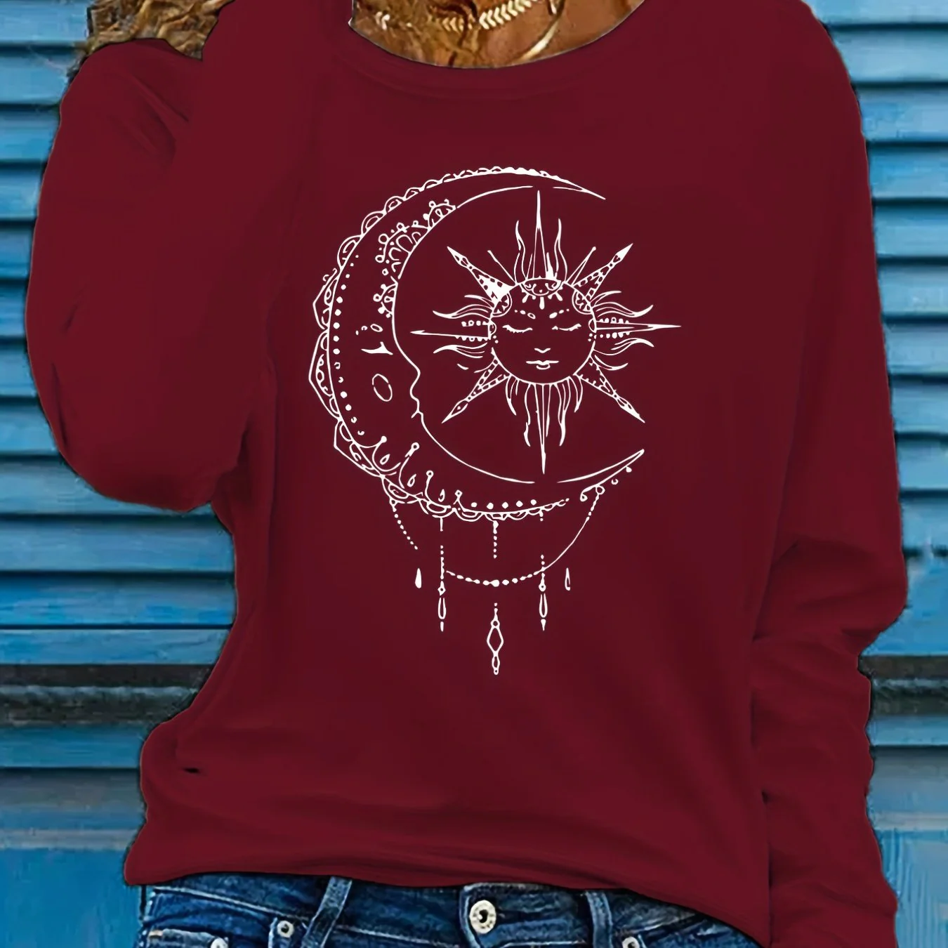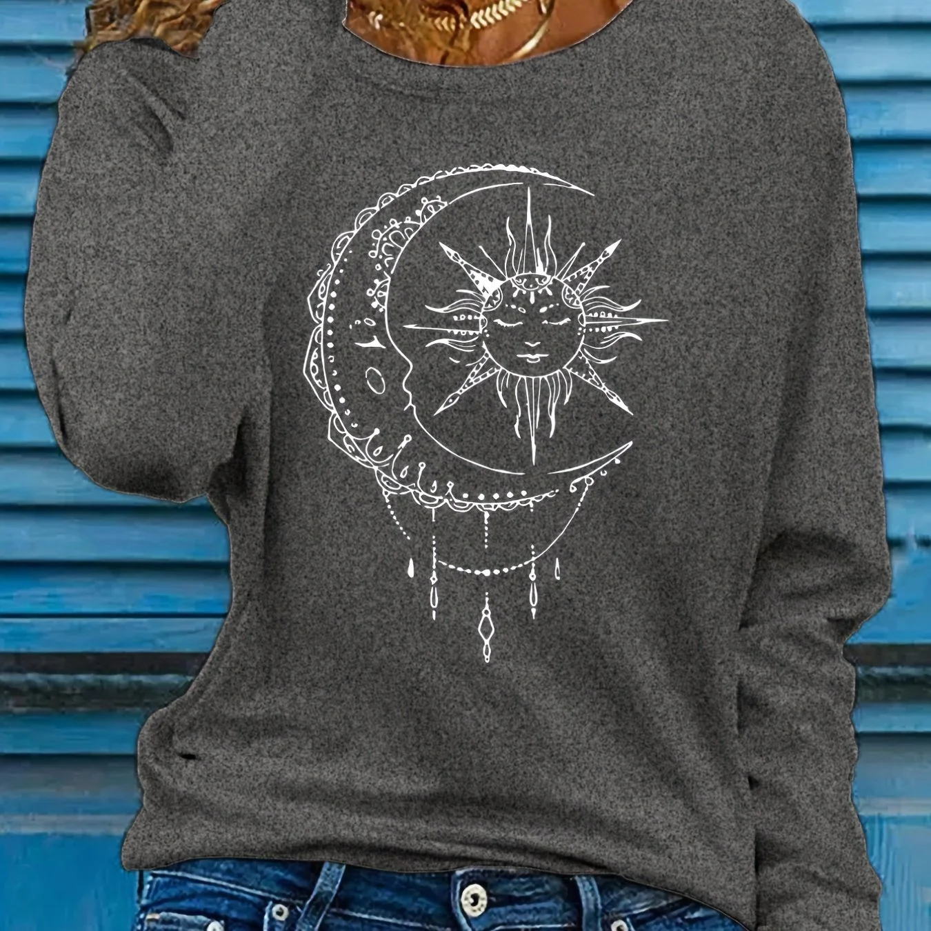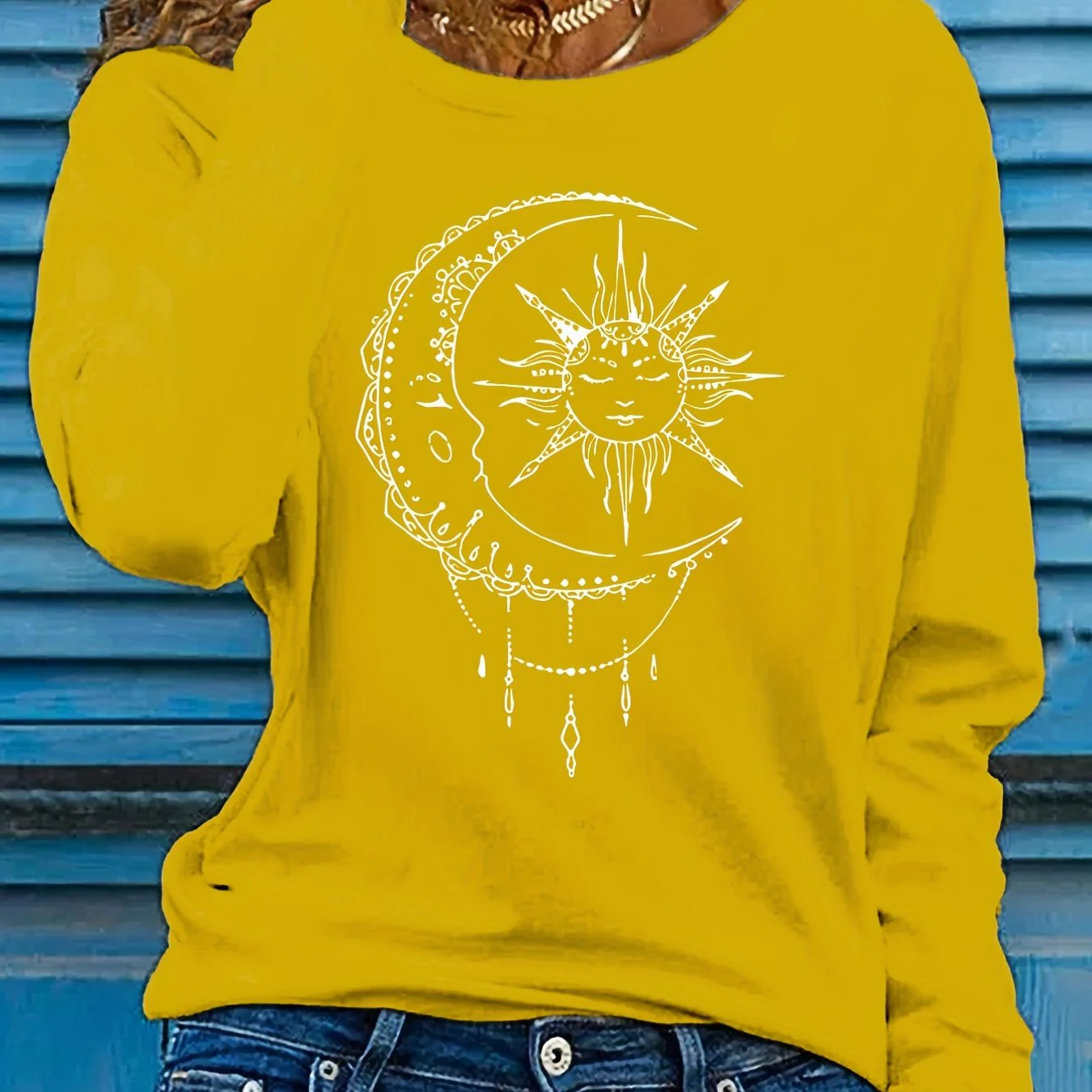 deanwangkt Sun & Moon Print Crew Neck T-shirt, Casual Long Sleeve T-shirt, Women's Clothing