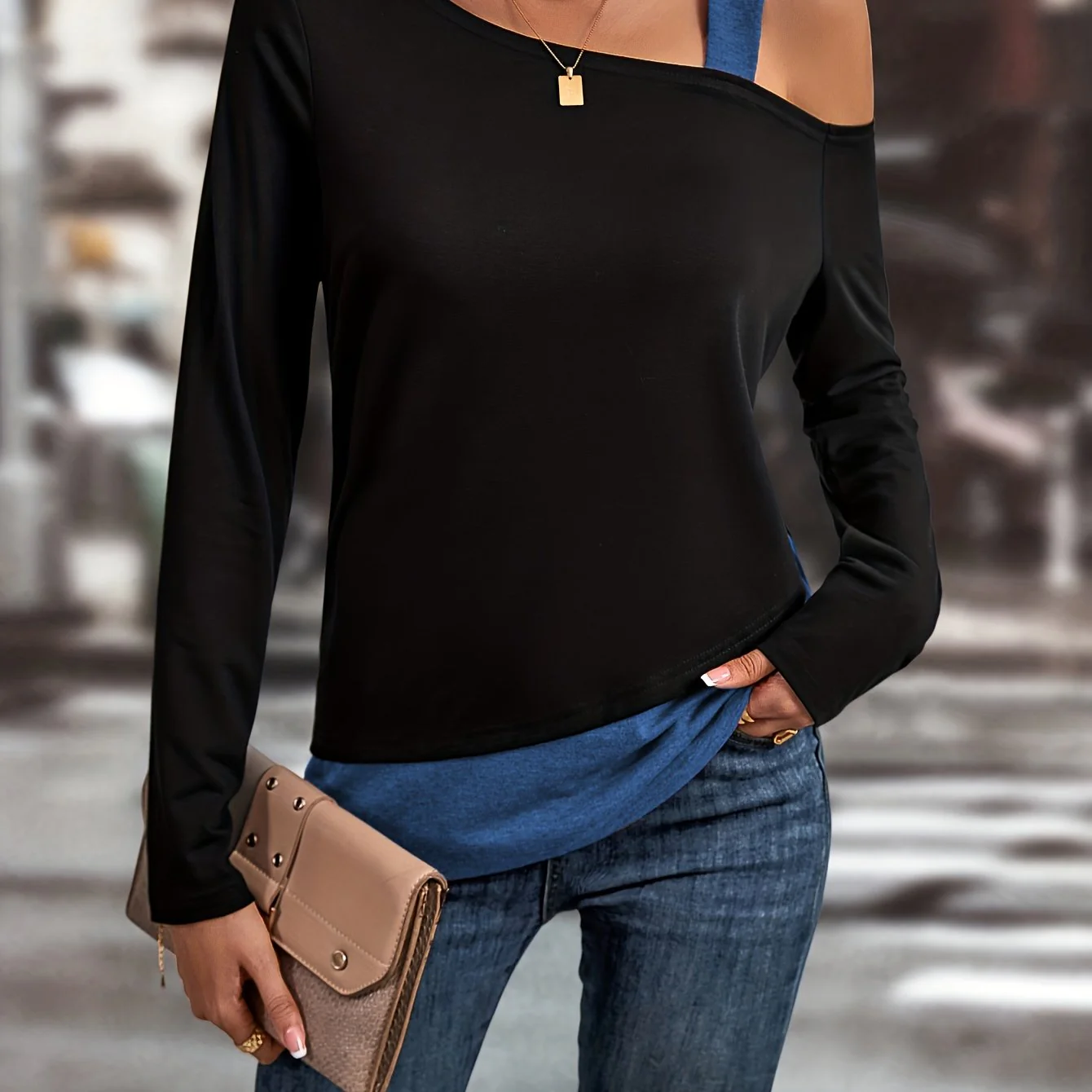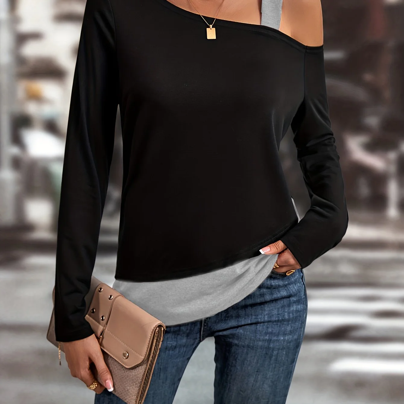 deanwangkt Colorblock Cold Shoulder T-Shirt, Casual Long Sleeve Top For Spring & Fall, Women's Clothing