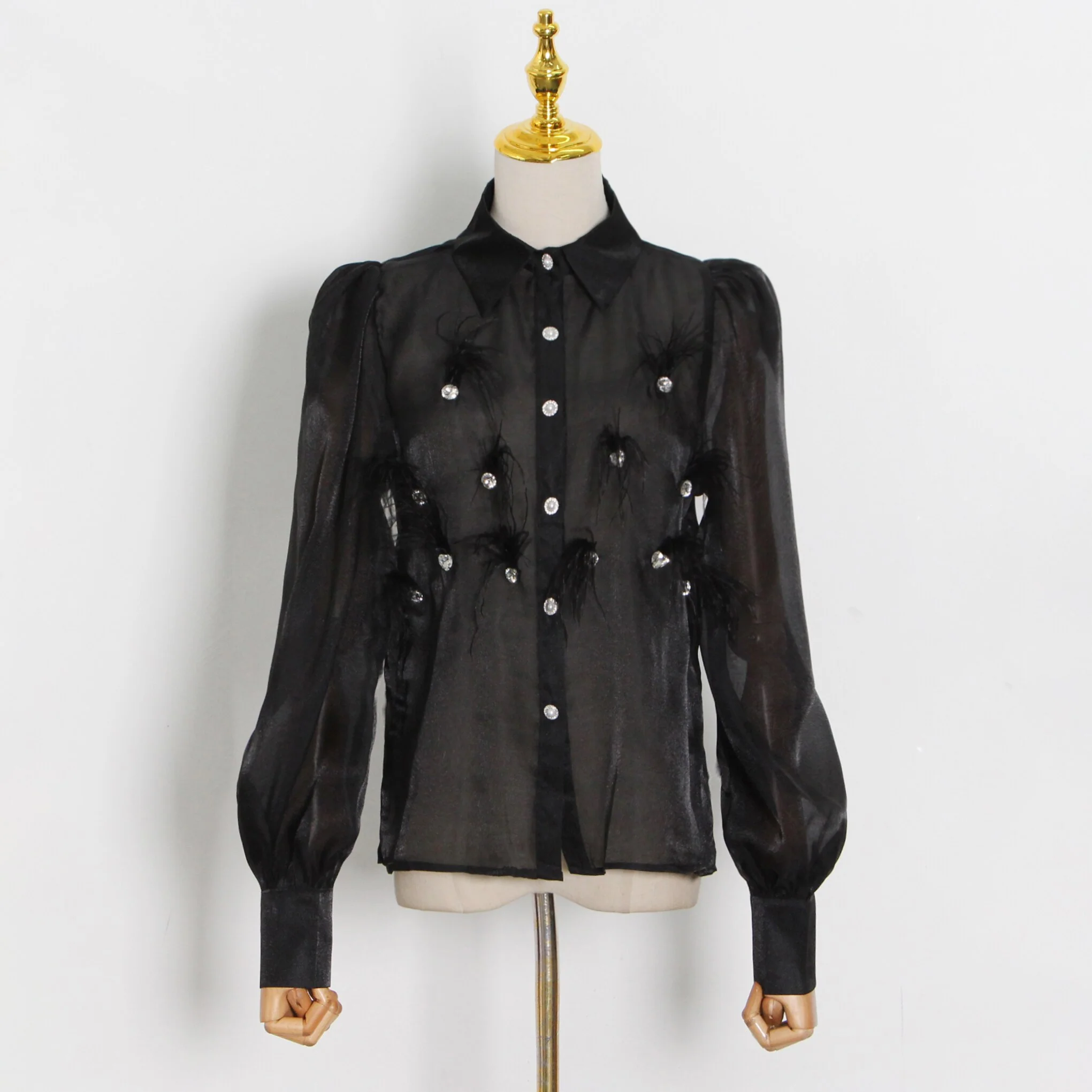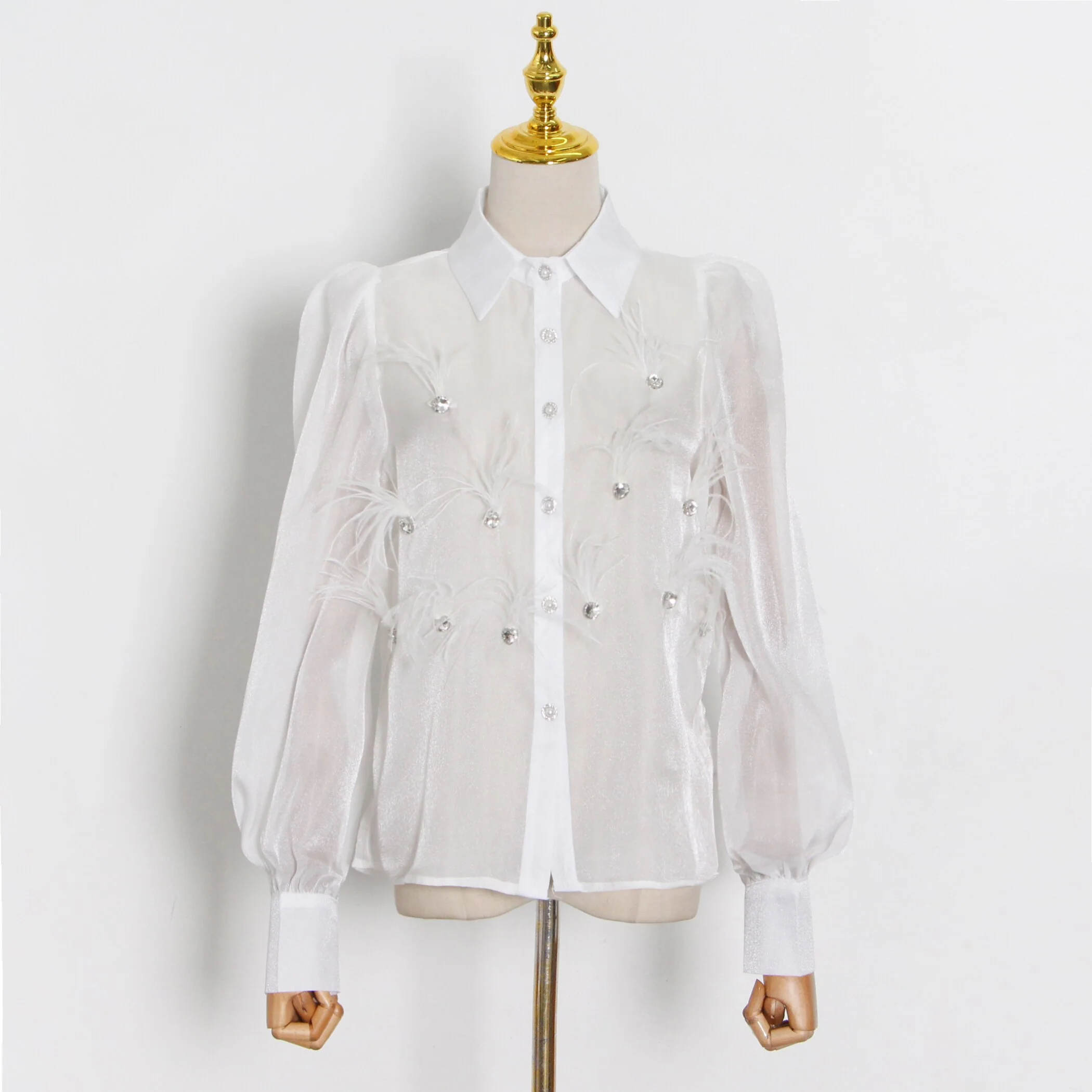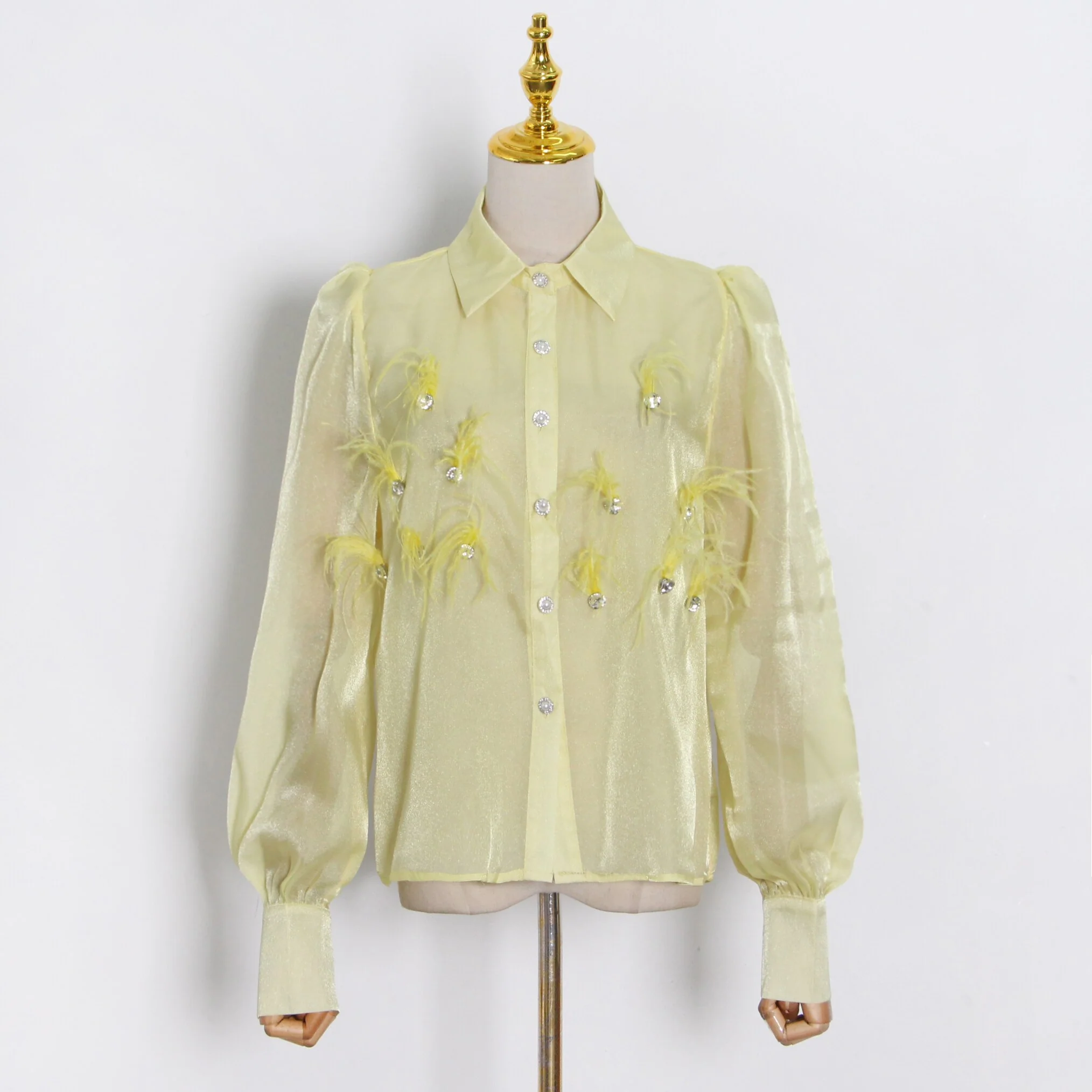 deanwangkt Casual Solid Shirt For Women Lapel Long Sleeve Patchwork Feathers Button Through Blouse Female Fashion Clothing New
