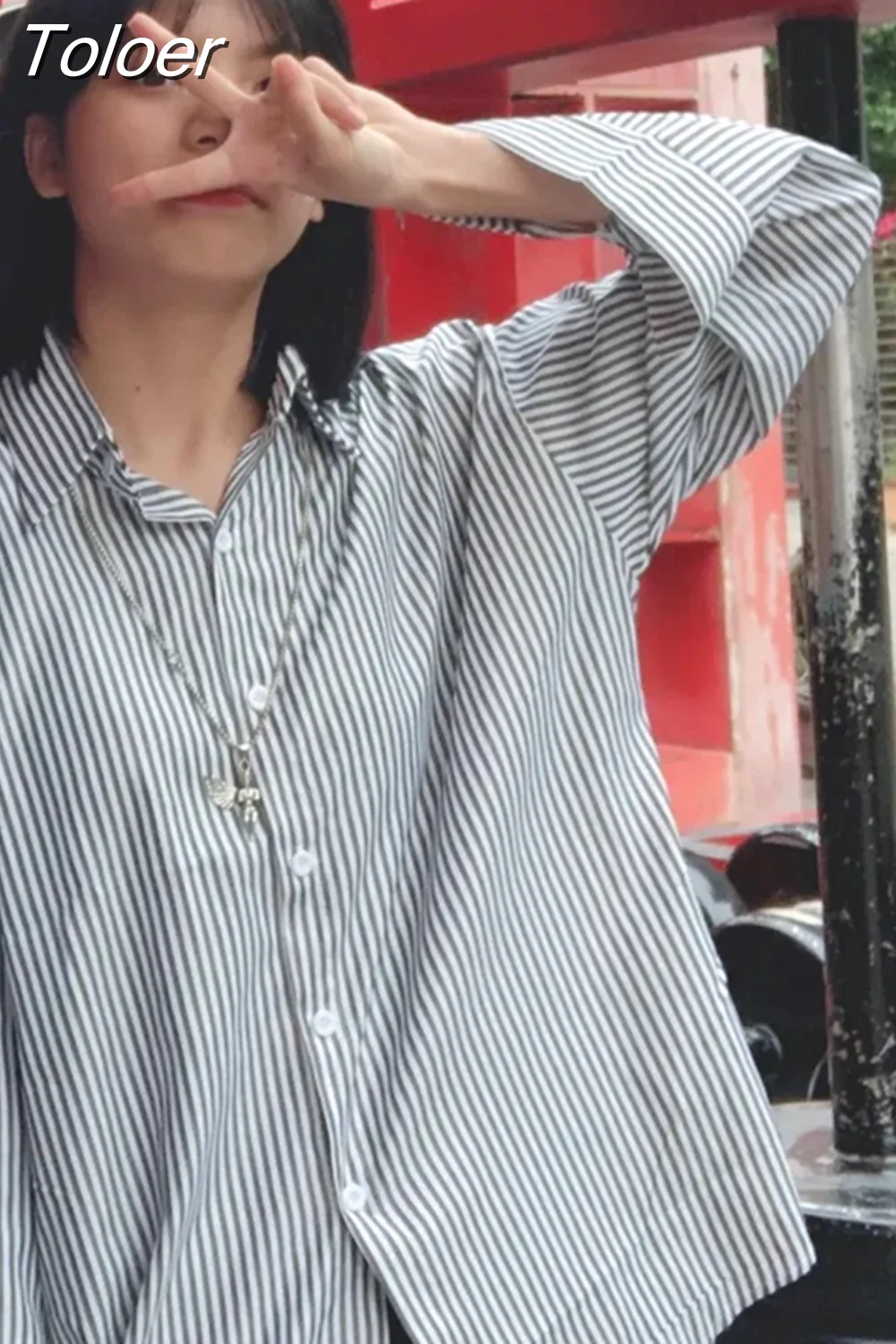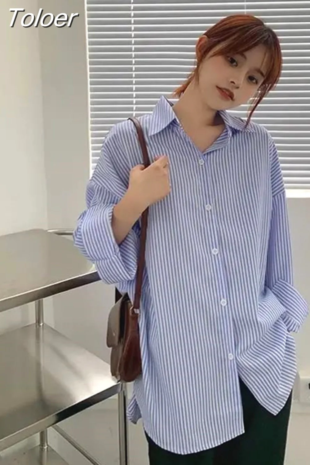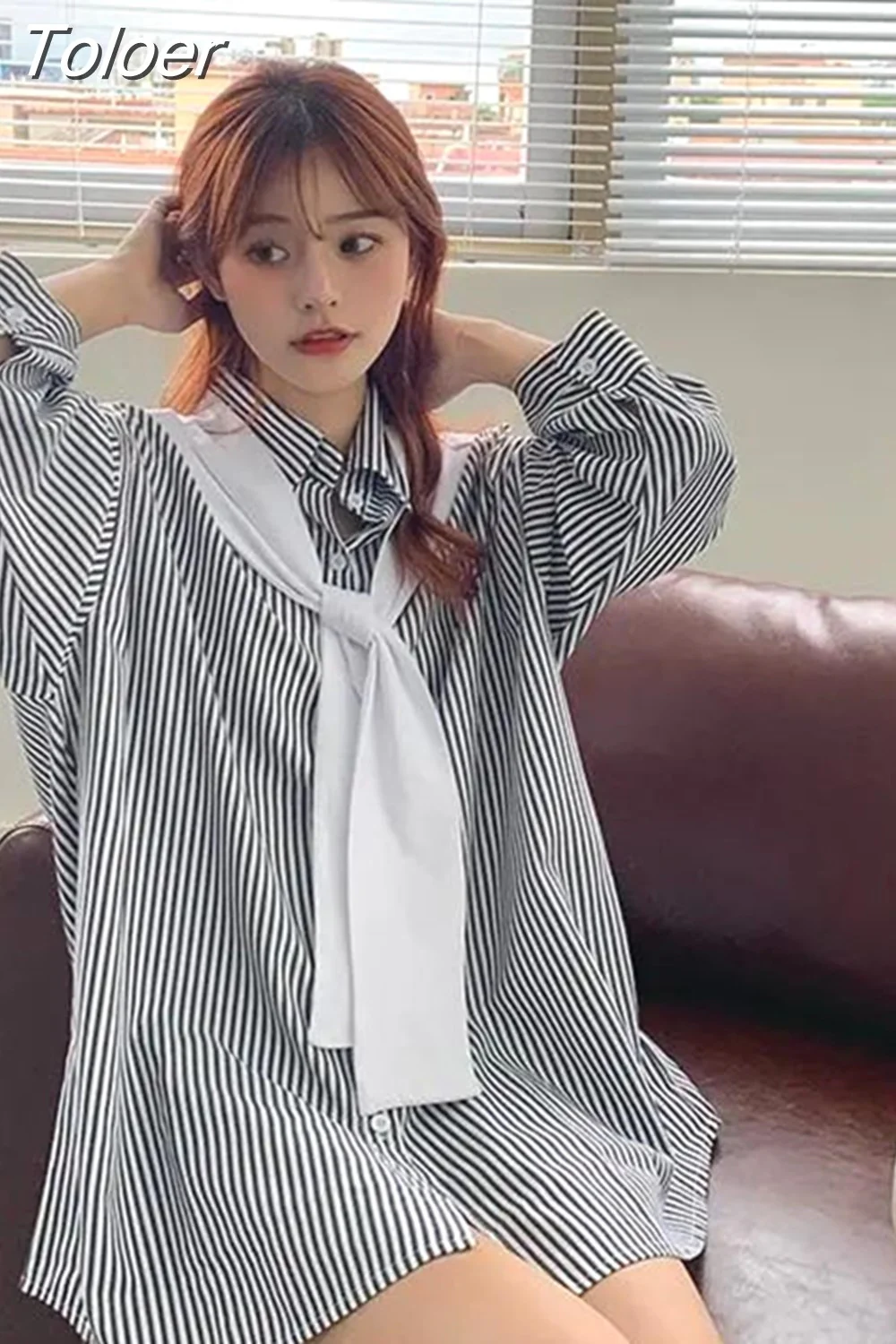 deanwangkt Blouses Shirts Women Blue Striped Elegant Loose Large Size Chic Fashion Scarf Collar New Leisure Womens Shirt Oversized