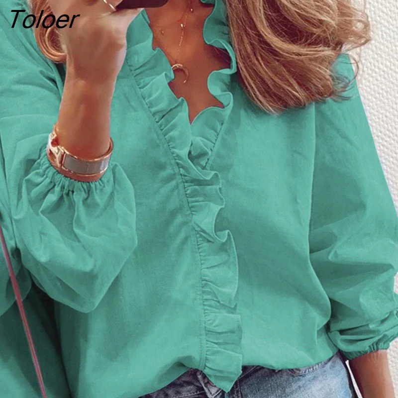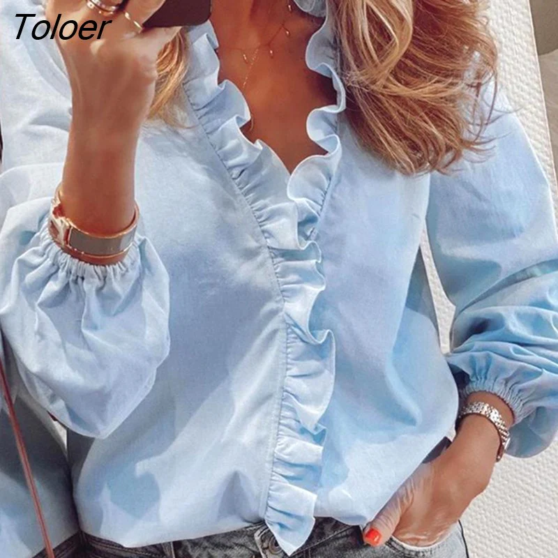deanwangkt Ladies Shirt Vintage Ruffle Long Sleeves Slim Fit Solid Color Women Shirt Elegant Office Lady Blouse