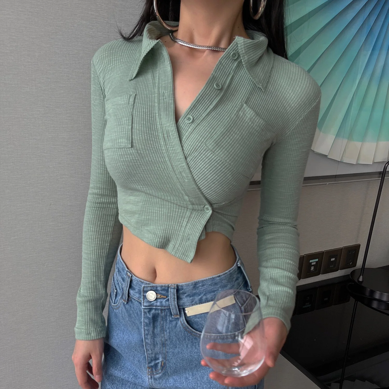 deanwangkt Korean Style Sexy Slim Mint Green Shirt Women Ribbed Irregular Crop Top Autumn Fashion Designer Clothes Ladies Blouses