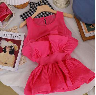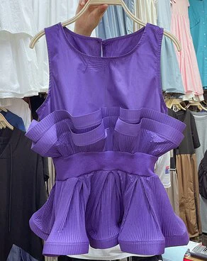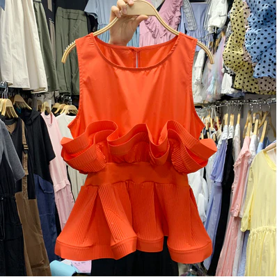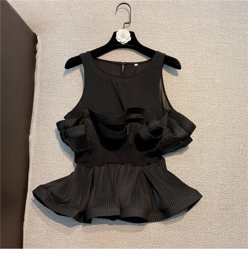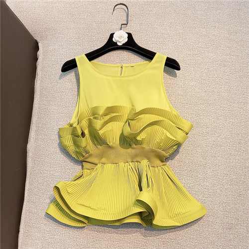 deanwangkt Solid Color Sweet Pleated Ruffles Patchwork Shirt Women Sleeveless Slim Chiffon Blouse Top for Lady