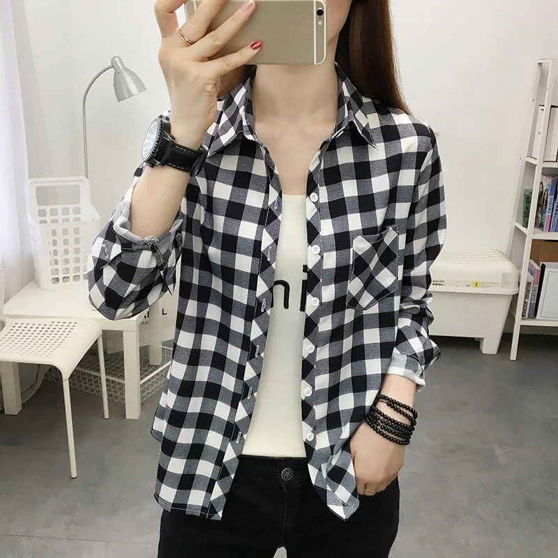 deanwangkt Spring Plaid Printed Wmen's Shirt Korean Fashion Inside Top Cardigan Oversized Long-sleeved Blouses Woman Shirts Button Up