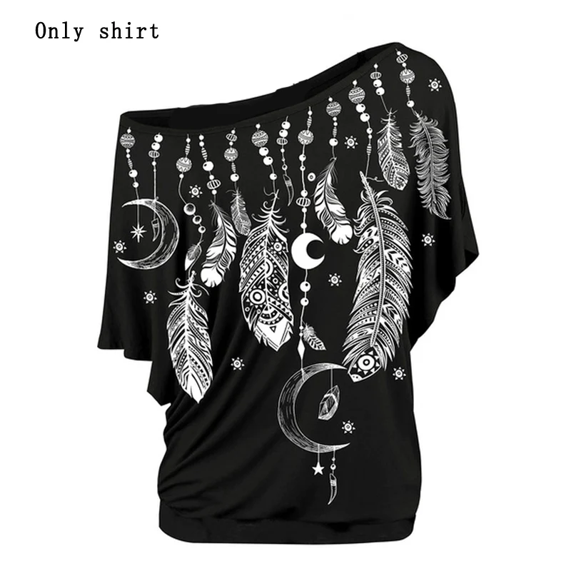 deanwangkt Women Shirts Blouses Summer Feather Print One Shoulder Top Casual Ladies Sexy Tops Skew Neck Shirts Blouse