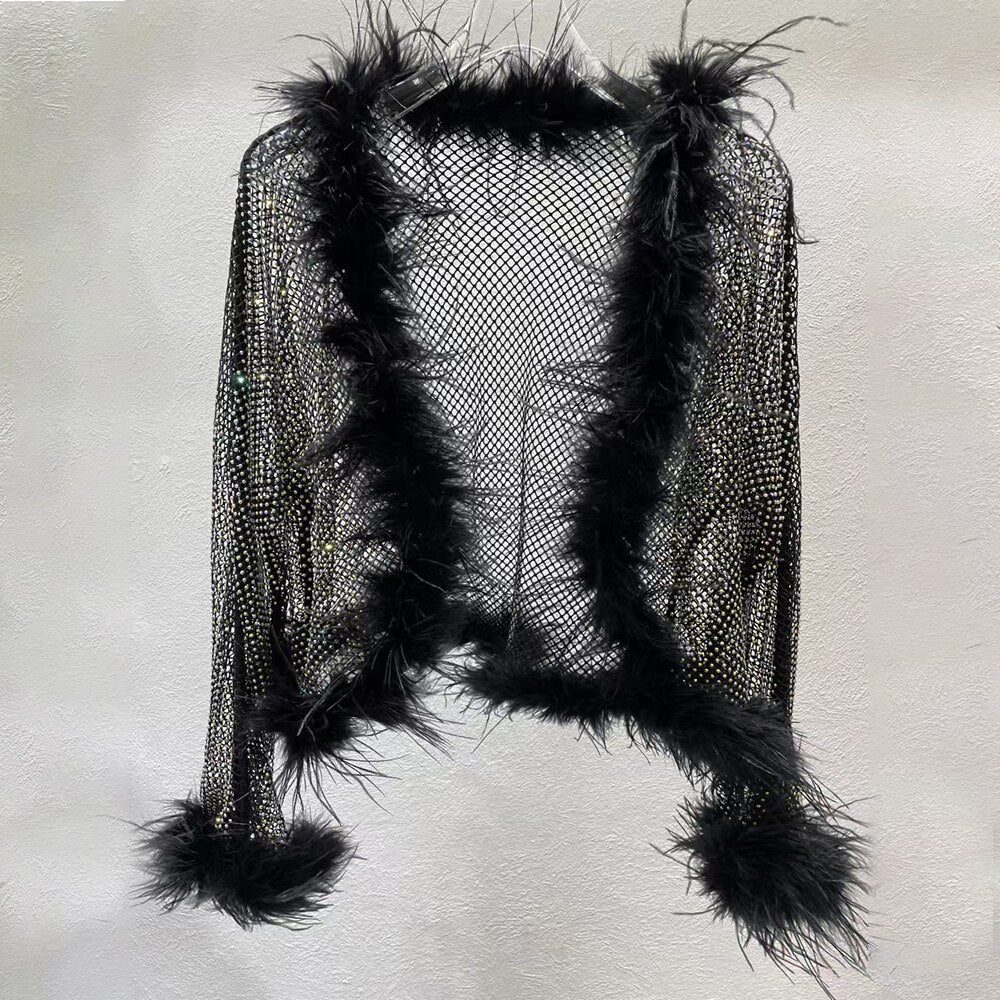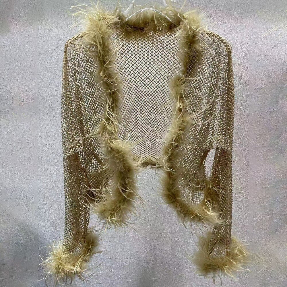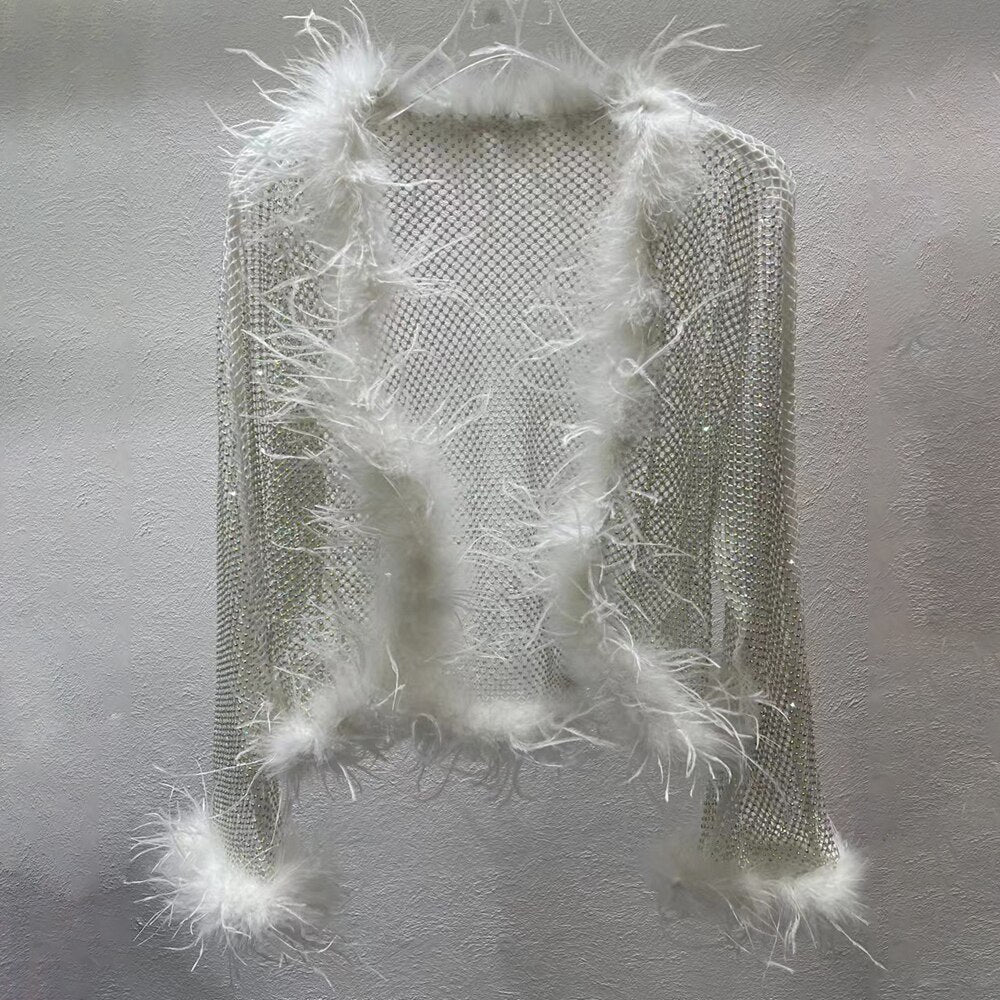 deanwangkt Sexy Diamonds Feathers Tassels Shirt For Women V Neck Long Sleeve Slim Open Stitch Blouses Female Autumn Clothing