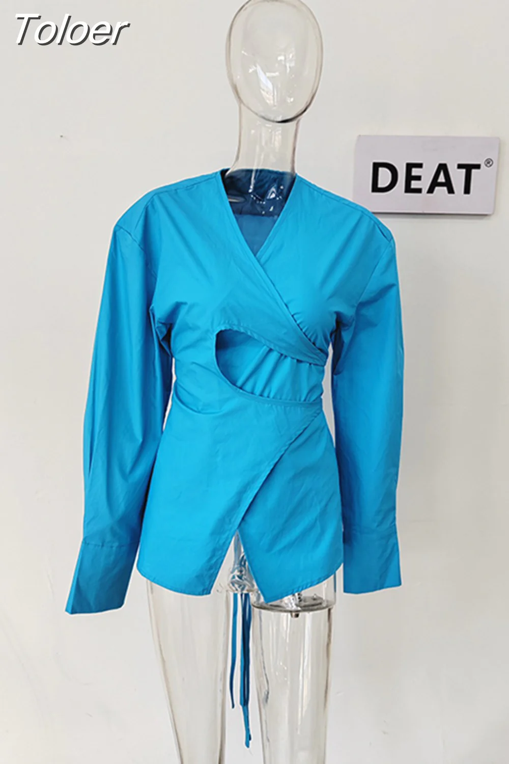 deanwangkt Fashion Women's Shirt V-neck Cross Bandage Waist Irregular Yellow Long Sleeve Blouse Causal Tide Summer New CP0418