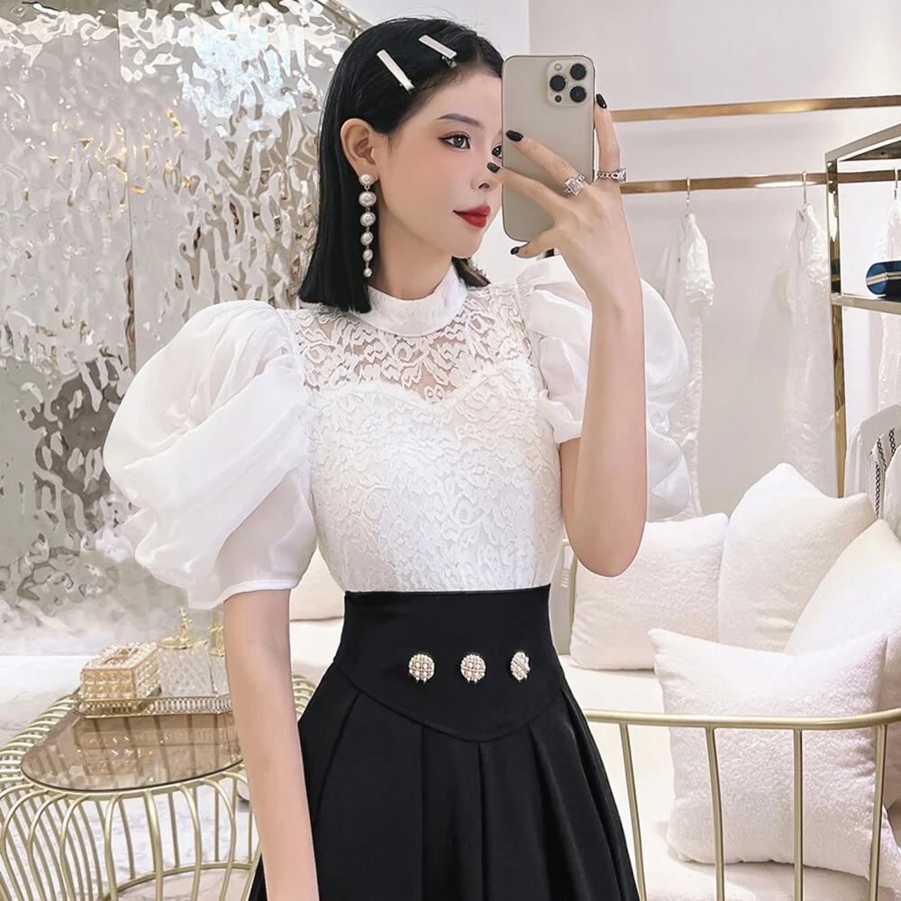 deanwangkt Elegant Lace Panel Shirt For Female Stand Collar Puff Sleeve Solid Minimalist Slim Pullover Blouses Female Clothing