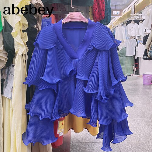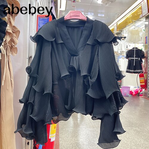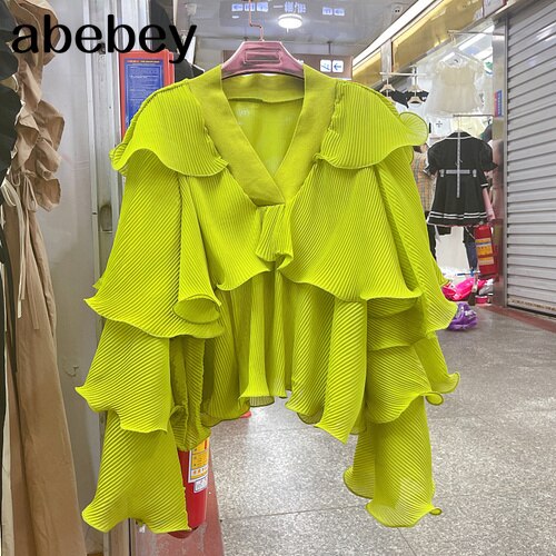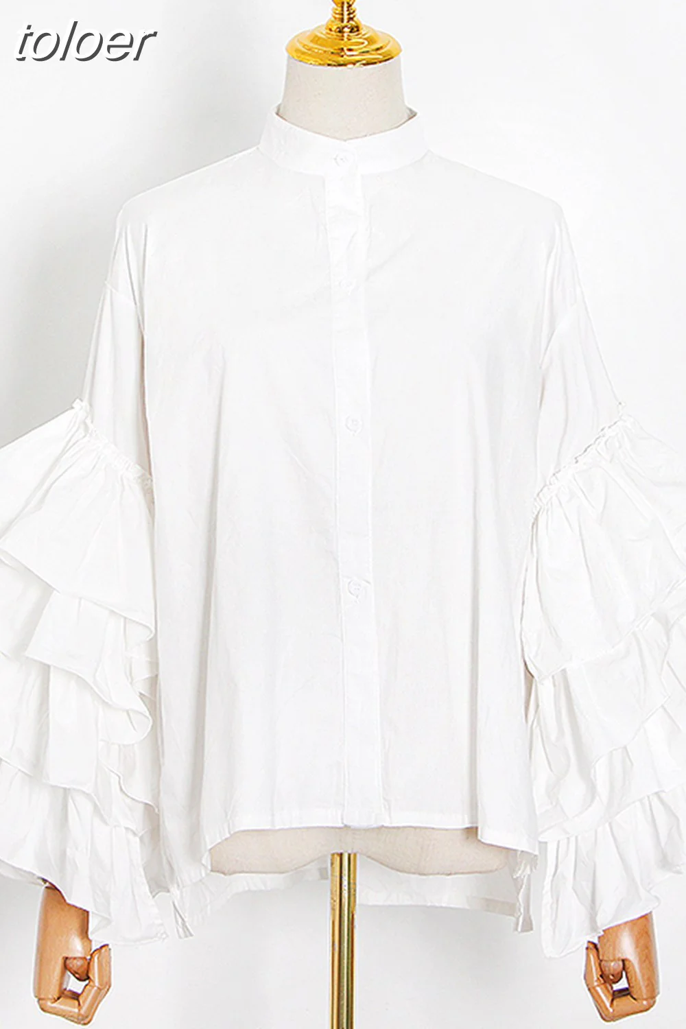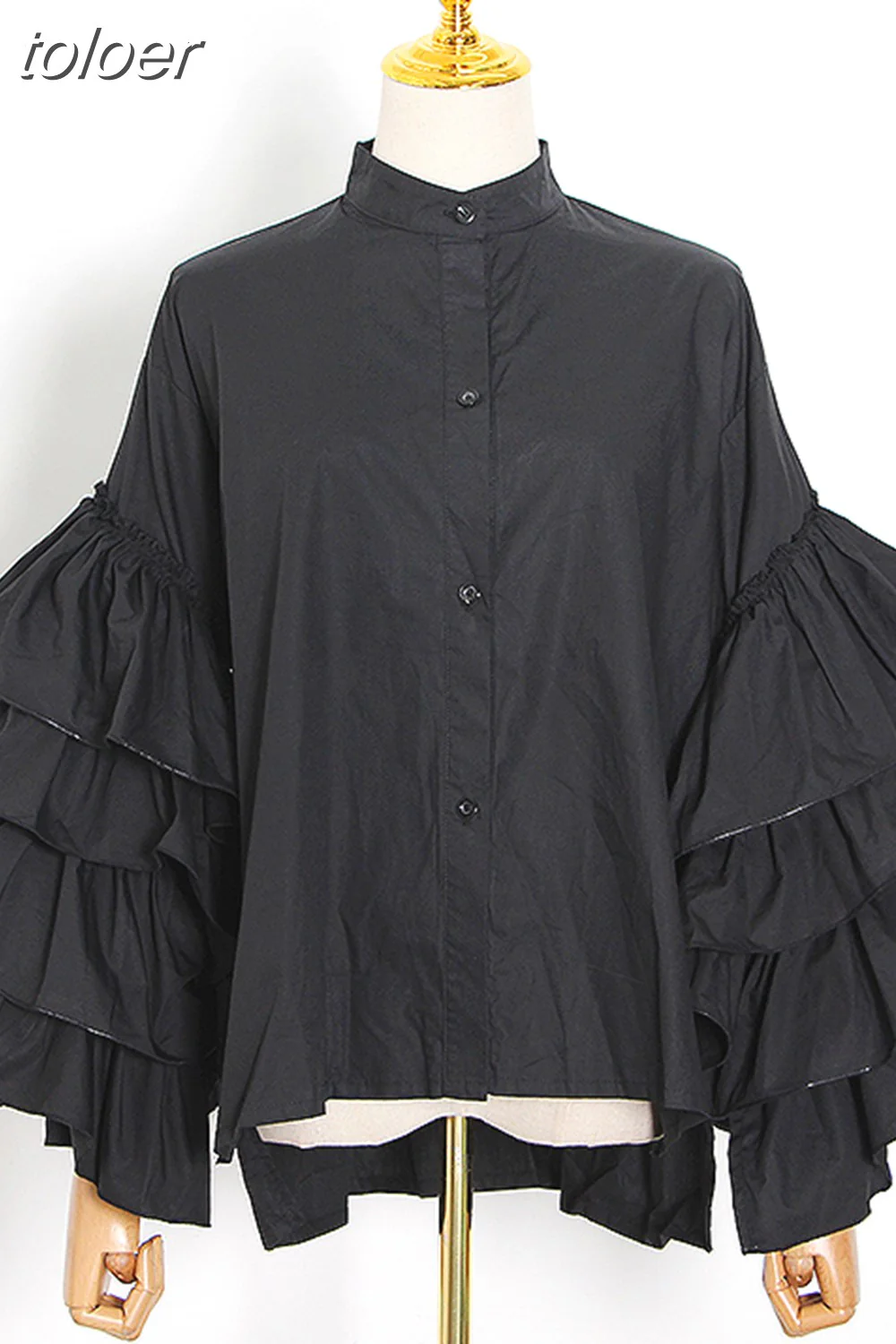 deanwangkt Loose Solid Shirt For Women Stand Collar Lantern Sleeve Patchwork Ruffle Single Breasted Chic Blouse Female Spring