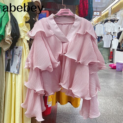 deanwangkt Striped Patchwork Ruffle Blouse For Women V Neck Long Sleeve Elegant Shirt Female Fashion Clothing Spring