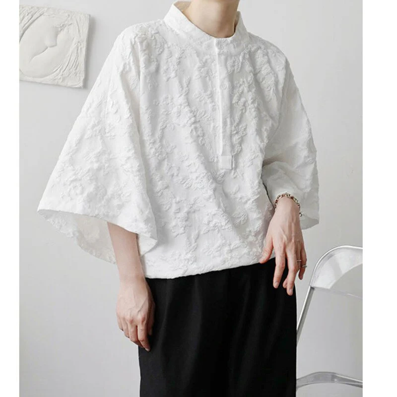 deanwangkt Women White Jacquard Big Size Blouse New Stand Collar Three-quarter Sleeve Shirt Fashion Tide Spring Autumn 1DF0855