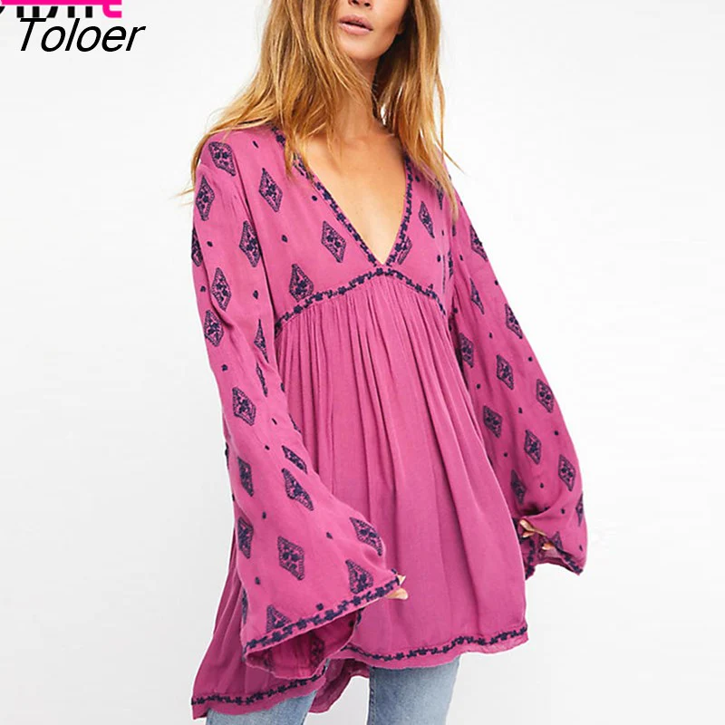 deanwangkt V-Neck Long Sleeve Spring Summer Shirt Blouse Women Diamond Embroidered Top Blusa Big Hem Casual Beach Top Shirts Blouses