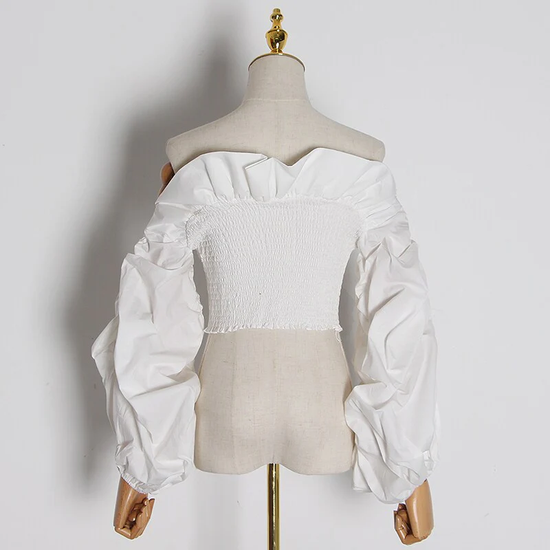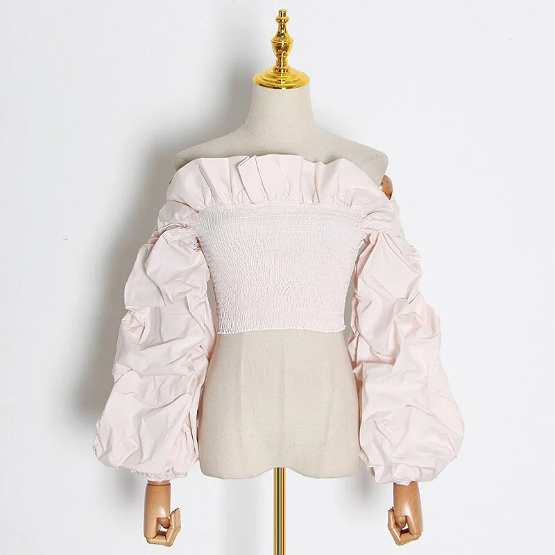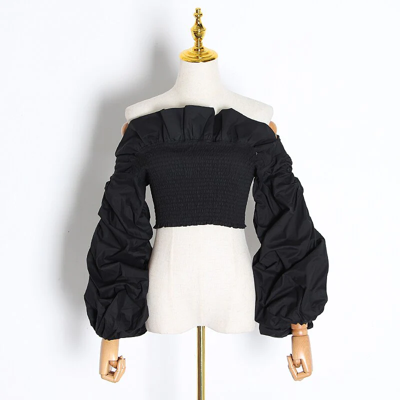 deanwangkt Ruched Ruffles Blouses Womens Slash Neck Lantern Long Sleeve Slim Short Shirts For Female Fashion Clothes New