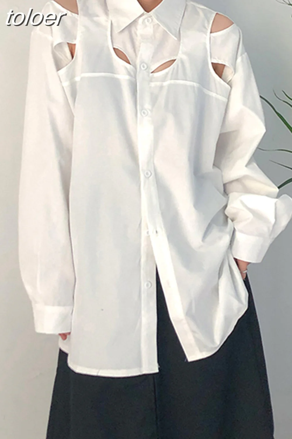 deanwangkt Minimalist Shirt For Women Lapel Long Sleeve Hollow Out Patchwork Casual Loose Blouse Female Autumn Clothing New