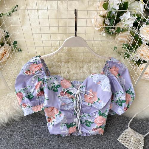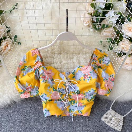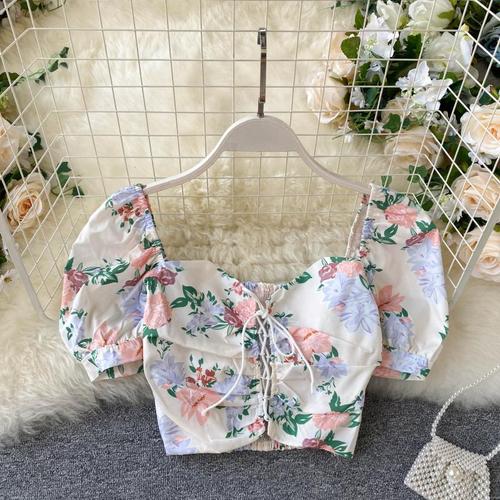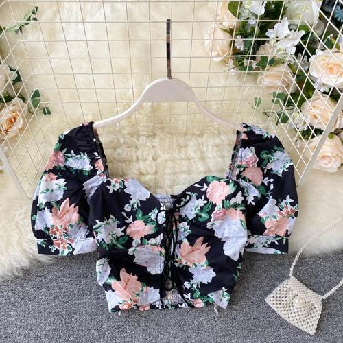 deanwangkt Short Blouses Women Fashion Sexy Bandage Crop Top Summer Vintage Gothic Shirt Ladies Flower Print Top Feminine