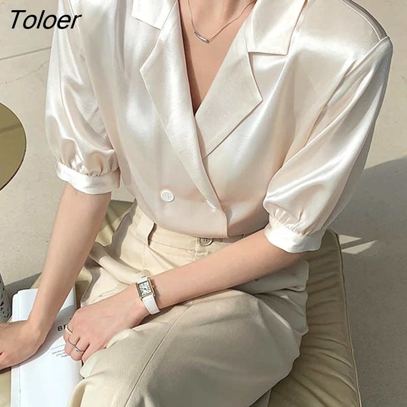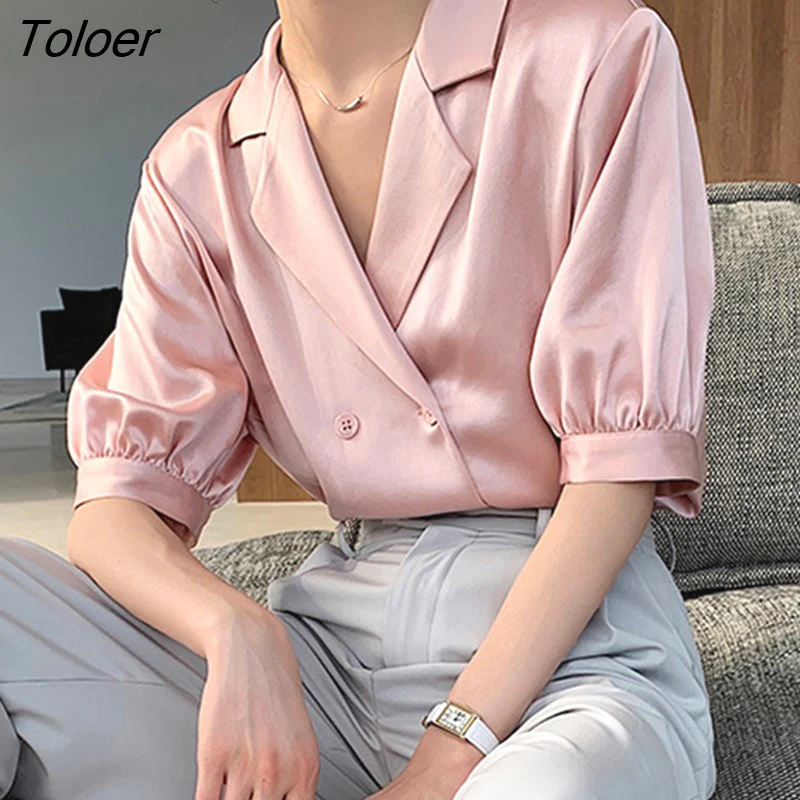 deanwangkt Pink Satin Blouse Women Summer Notched Solid Silk Woman Shirts Puff Sleeve Tops Double-breasted Casual Blue Blouses 22187