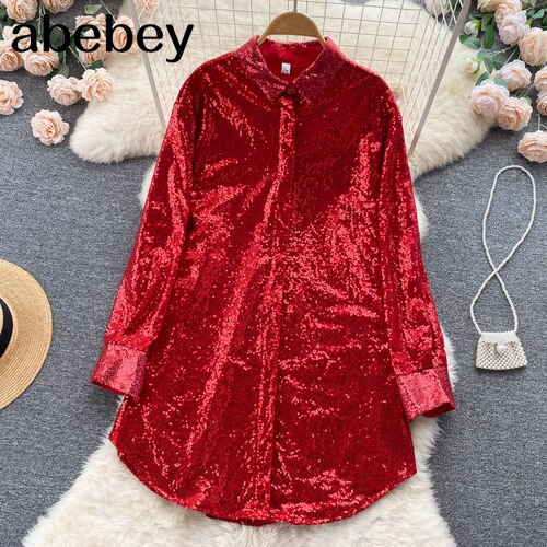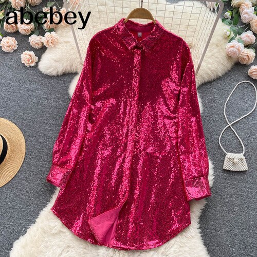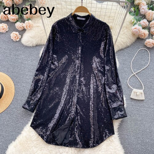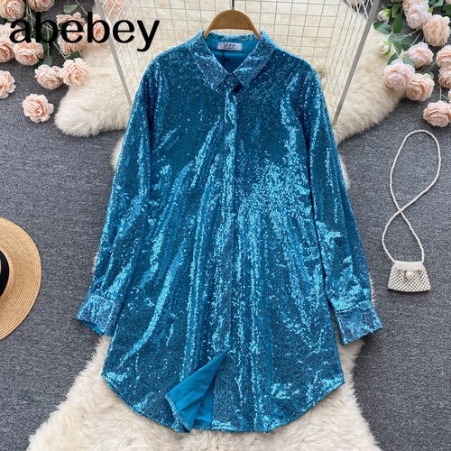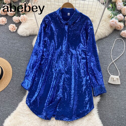 deanwangkt Blouse Shirts Long Sleeve Top Button Up Shirt Y2K Vintage Women Clothing Club Party Glitter Top Female Collared Shirt
