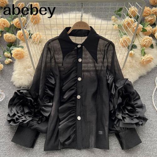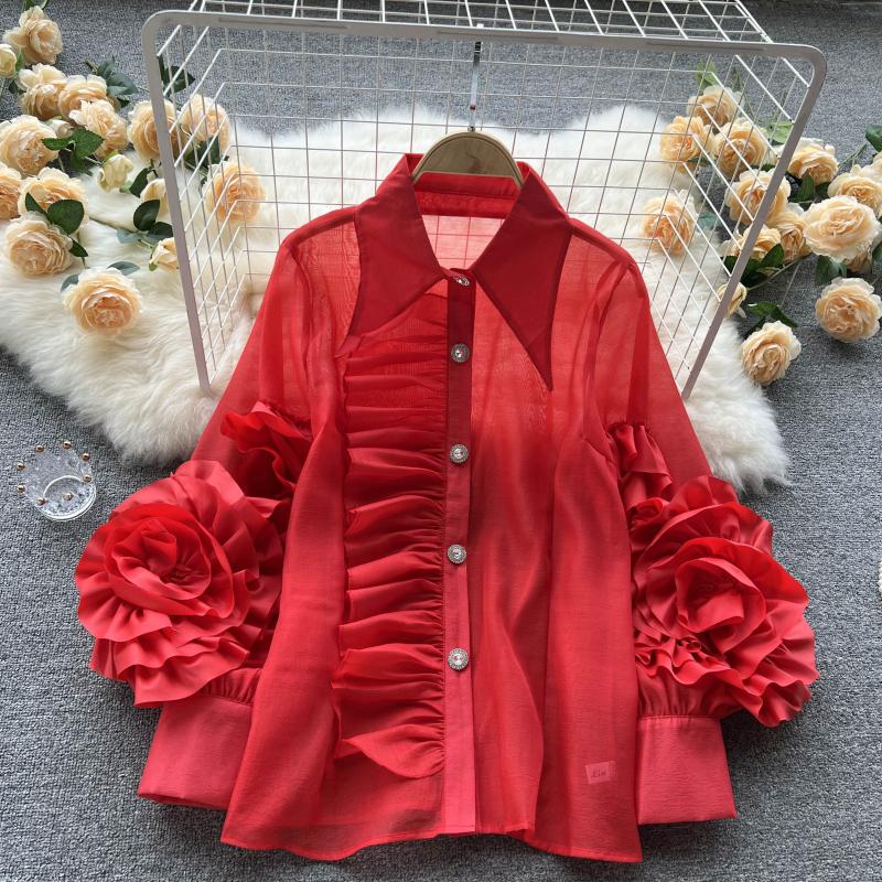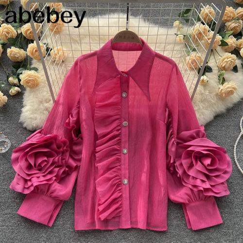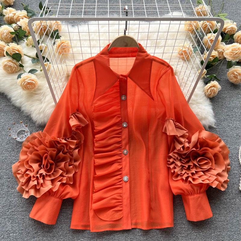 deanwangkt Ruffle Trim Shirt For Women Lapel Lantern Sleeve Loose Solid Button Through Blouse Female Fashion Clothing