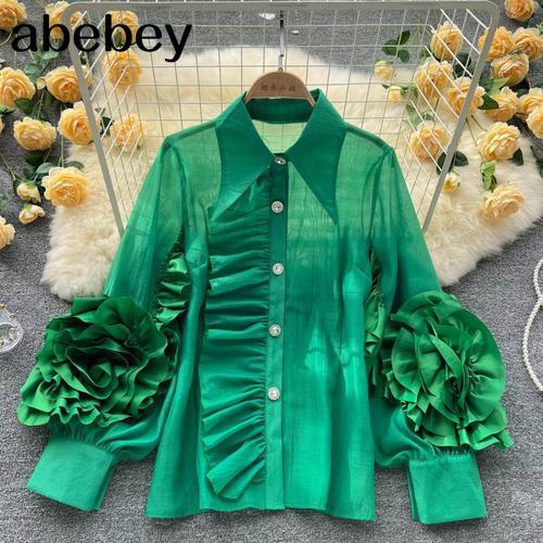 deanwangkt Green Chiffon Shirt Blouse Elegant Ruffle Lapel Lantern Sleeve Spring Women'S Blouse Casual Fashion Buttons Down Tops Lady